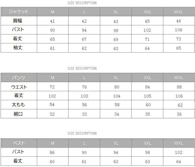 商品の詳細 内容 ○ジャケット+ベスト+パンツ 素材 ポリエステル ●伸縮性:少し ●生地厚さ:普通 生産国 中国 カラー 写真通り サイズ(単位:cm) S/M/L/XL/2XL/3XL/4XL/5XL 商品について ※サイズ表記は目安です。若干の誤差がある場合がございます。 ※製造中(縫製、染色など)により商品において色味や柄、サイズに若干の誤差や、生地を織る際に糸の継ぎ目や多少のほつれ等が生じる場合がございますが、品質上の問題ではございませんのでご了承の上お買い求めくださいませ。 ※お客様ご使用のPC環境により商品画像のカラーが多少異なる場合があります。仕入時期により多少デザインなど異なる場合があります。ご了承ください。 ※モデルに使用している小物、アクセサリ等はセット内容に含まれません。 ※発送上の状態によって商品がシワになる場合がございます。予めご了承くださいませ。 発送について ※在庫確認、配送状況、休日を間にする事により、予定より遅くなる可能性がございます。 ※当店ではラッピングのサービスを行っておりません、ご了承くださいませ。 【配送希望時間帯をご指定出来ます】 午前中・14時〜16時・16時〜18時・18時〜21時 ただし時間を指定された場合でも、事情により指定時間内に配達ができない事もございます。 配達会社 【ヤマト運輸】【佐川急便】商品の詳細 内容 ○ジャケット+ベスト+パンツ 素材 ポリエステル ●伸縮性:少し ●生地厚さ:普通 生産国 中国 カラー 写真通り サイズ(単位:cm) S/M/L/XL/2XL/3XL/4XL/5XL 商品について ※サイズ表記は目安です。若干の誤差がある場合がございます。 ※製造中(縫製、染色など)により商品において色味や柄、サイズに若干の誤差や、生地を織る際に糸の継ぎ目や多少のほつれ等が生じる場合がございますが、品質上の問題ではございませんのでご了承の上お買い求めくださいませ。 ※お客様ご使用のPC環境により商品画像のカラーが多少異なる場合があります。仕入時期により多少デザインなど異なる場合があります。ご了承ください。 ※モデルに使用している小物、アクセサリ等はセット内容に含まれません。 ※発送上の状態によって商品がシワになる場合がございます。予めご了承くださいませ。 発送について ※在庫確認、配送状況、休日を間にする事により、予定より遅くなる可能性がございます。 ※当店ではラッピングのサービスを行っておりません、ご了承くださいませ。 【配送希望時間帯をご指定出来ます】 午前中・14時〜16時・16時〜18時・18時〜21時 ただし時間を指定された場合でも、事情により指定時間内に配達ができない事もございます。 配達会社 【ヤマト運輸】【佐川急便】