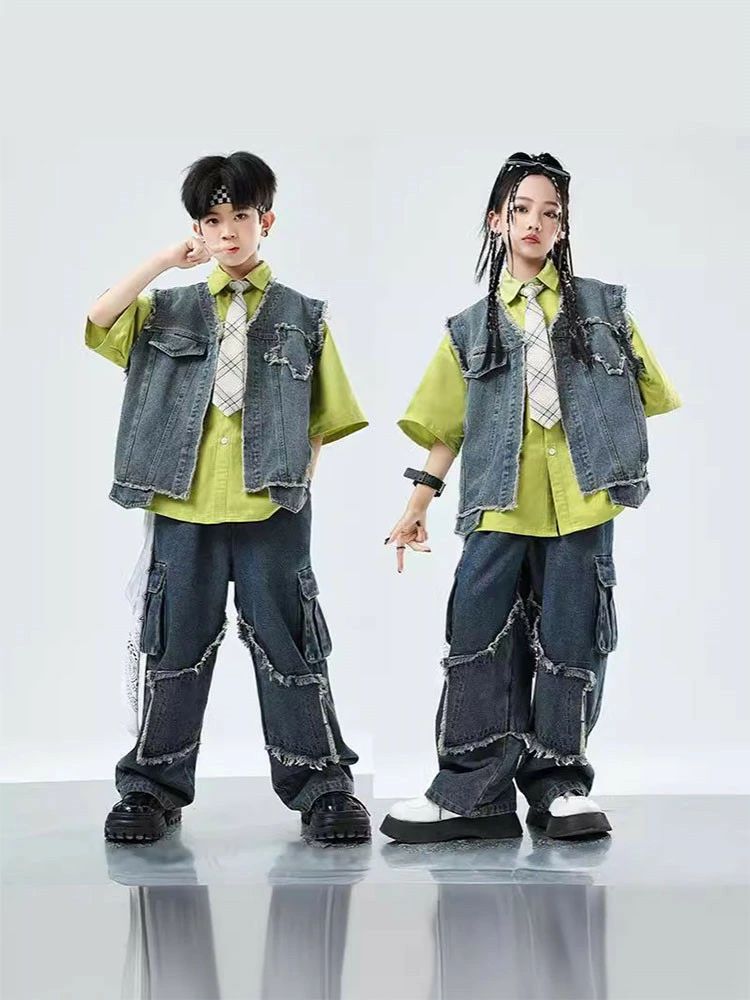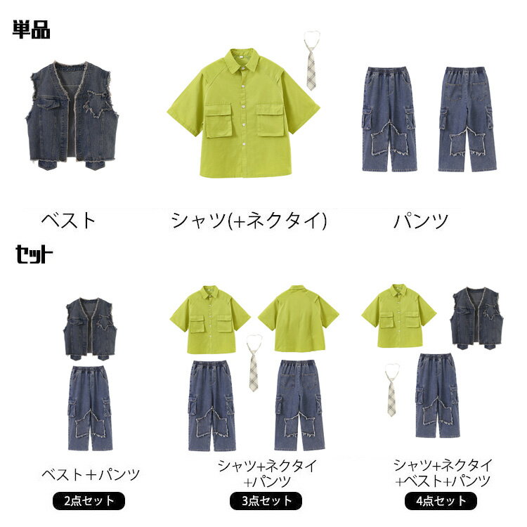 キッズ ダンス衣装 デニム ベスト グリーン シャツ カーゴパンツ ネクタイ セットアップ 上下セット おしゃれ 女の子 男の子 かっこいい かわいい 長袖 ゆったり ダンスウエア ヒップホップ ジャズダンス 韓国 k-pop 舞台服 演出服 練習着 団