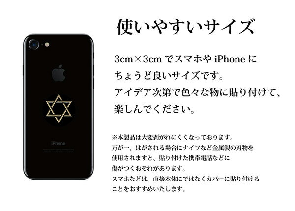 五芒星(ごぼうせい) 五芒星の蒔絵シール登場!風水では六芒星の六つの角は 邪気や災難を払うとされています。 世界各国で魔除けのモチーフとして使われています。 携帯やスマホ、色んな所に貼れるワンポイントシールです。はがれにくい強力な粘着力が特徴です! ー詳細ー ■シールサイズ 横35mm x 縦35mm ■柄サイズ 横30mm x 縦30mmに収まるサイズ ※サイズについて詳しくは商品画像をご覧下さい。 ■生産国 日本 ・蒔絵シールとは? 柄のみが残るタイプのステッカーです。 貼り付けかんたん、他に類を見ない質感と輝き、抜群の耐久性と粘着力が特徴です。 硬質でツルツルした平面であればスマートフォン、ゲーム機、自転車、マグカップなど 水・洗剤で洗うものや、屋外で使用するものにも貼ることができます。 (電子レンジ、食器洗い乾燥機使用不可) ●注意● 蒔絵シールは一般のシールとは違い、強粘着のシールになっており一度貼ると剥がすのが困難です。 スマートフォンには直接本体ではなく カバーに貼ることをお勧めしております。 色違い(30mmタイプ)はこちら 五芒星はこちら