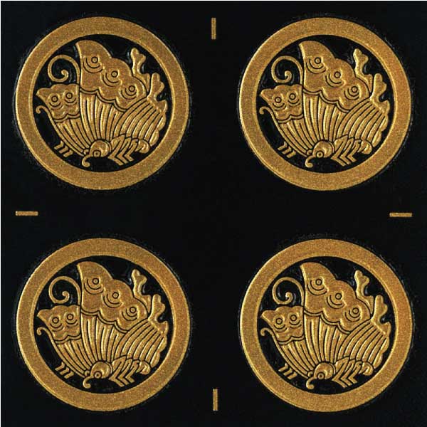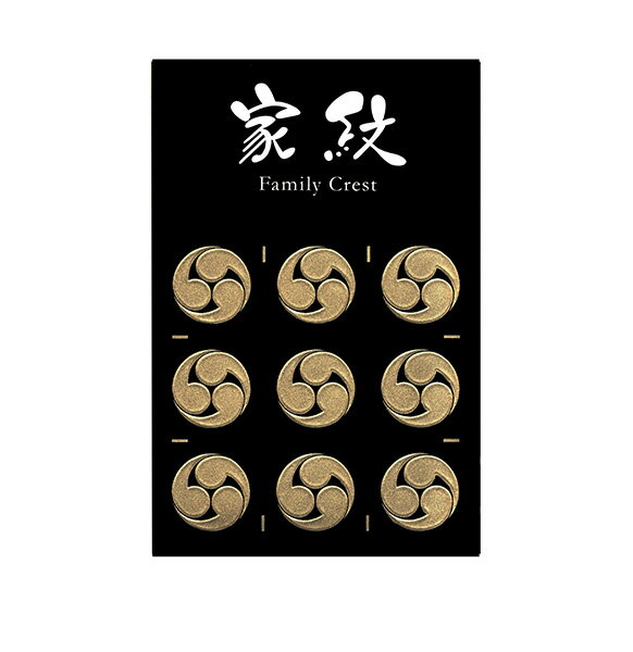 巴 巴は、武士の弓手に巻く皮具、(鞆絵=ともえ)をかたどったものとされている。 この武具は渦巻き型で、これに巴(は)という漢字を当て、「ともえ」と読ませた。 ゆえに巴はいつの頃から武具を意味指す言葉ではなくなり、渦巻きを表す言葉になった。 古代の宝器であった勾玉が巴形で、これが神霊のシンボルに移転したため、 巴の形に神秘性が見出され、神紋として尊重された。 北関東に非常に多い家紋。 山本勘助「左三つ巴」、小早川秀秋「三頭右巴」、長尾景虎「九曜右巴」 土方歳三「左三つ巴」 ※シール柄サイズ:(約)1.5cm×1.5cm 24mmタイプはこちら 30mmタイプはこちら 55mmタイプはこちら 蒔絵 蒔絵ステッカー 蒔絵シール シール ステッカー まきえ 家紋 かもん 金家紋 蒔絵 ゴールド 転写シール ケータイ 携帯電話 スマホ スマートフォン 剣道 胴 和 伝統 強力 はがれにくい 耐久性 耐水性