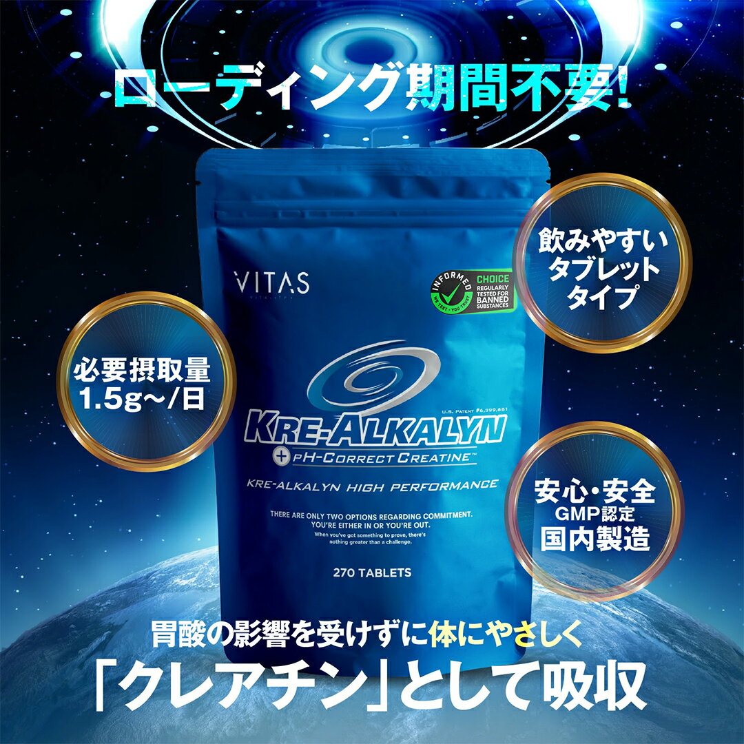 クレアルカリン VITAS アンチドーピング クレアチン モノハイドレート タブレット 270粒 ハイパフォーマンス アミノ酸 サプリメント 筋力 瞬発力 バイタス 公式 スポーツ トレーニング フィットネス 男性 女性 ローディング不要 ビタパワー