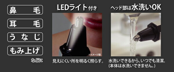 ●2種類のカッターで顔スッキリ! ●鼻毛アタッチメントを差し込むだけで、鼻や耳の 恥ずかしいムダ毛がスッキリ! ●ムダ毛トリマーを使って、顔のうぶ毛やもみ上げ うなじをキレイに整えます。 ●すべてのセットを立てて収納できるスタンド付 ●へッド部は水洗いOK!衛生的に使えます。 商品詳細 サイズ 本体:(鼻毛カッター付)13.6×2.8×3cm ムダ毛トリマー:3.9×2.4×2.8cm 専用スタンド:9×5.4×2.7cm 材質 本体:ABS樹脂・ステンレス鋼 刃:ステンレス鋼 仕様 単三乾電池×3本(別売) セット内容:本体・鼻毛カッター・ムダ毛トリマー スタンド・キャップ鼻・耳毛のカットやうぶ毛の処理はこれ一台でOK!