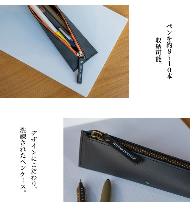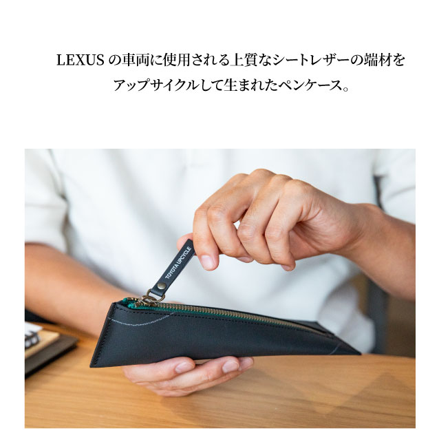 商品詳細 ・LEXUSの車両に使用される上質なシートレザーの端材をアップサイクルして生まれたペンケース。 ・ペンケースにはペンを約8〜10本収納可能。※ペンのみの収納の場合 ・アップサイクル商品特有の生産工程で発生するマーキング、傷、肌荒れ痕もストーリーとしてお楽しみください。 ・大切な人へ、"想い"も"地球"も大切にするギフトとしてぜひご活用ください。 【おすすめイベント】 父の日 母の日 敬老の日 クリスマス 誕生日 記念日 成人祝い 卒業祝い 進学祝い 進級祝い 就 職祝い 送別会 歓迎会 等 ※製品についている白い線はレザーの生産工場でつけるマーキングです。 この製品には“本革端材”が使われているためマーキングや傷、肌荒れ痕がついていることがあります。 (マーキングはウェットティッシュや消しゴムで除去することが可能です) サイズ・仕様 ・仕様:1ポケットのペンケース ・サイズ:全長215mm/高さ60mm/幅65mm ・金具カラー:アンティークゴールド ・ファスナー部布素材カラー:ブラック/ネイビー/グリーン/レッド/イエロー ・素材:牛本革 ・生産国:日本
