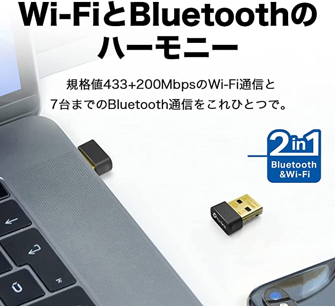 [特徴] BluetoothとWi-Fi通信を超小型ボディで実現。 [Bluetooth] Bluetooth 4.2に対応 [Wi-Fi規格] AC600規格 5GHz: 433Mbps , 2.4GHz: 200Mbps [対応OS] WiFiはWindows 11/10、BluletoothはWindows 11/10とそれぞれ互換性があります。 [高セキュリティ] WEP・WPA/WPA2/WPA3・WPA-PSK/WPA2-PSK・WPA3-SAE暗号化に対応しています。