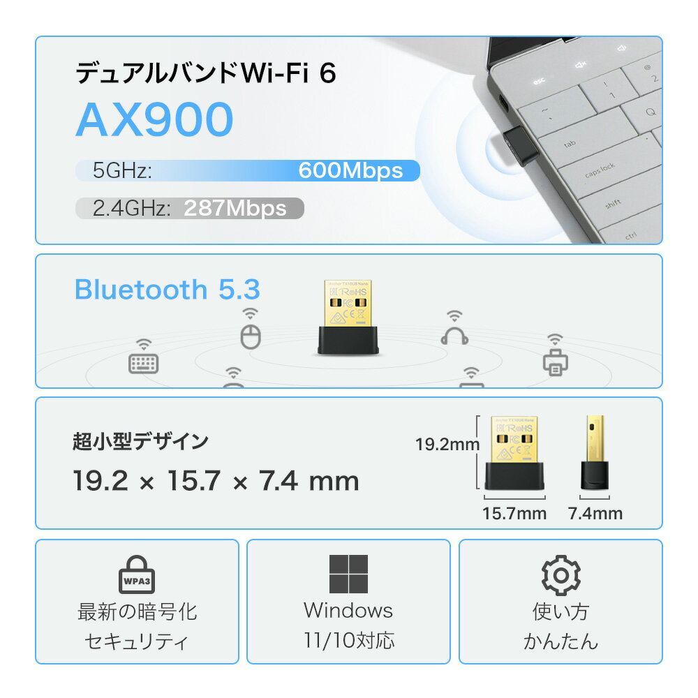 TP-Link WiFi 無線LAN 子機 usb 無線LANアダプター nano 超小型 AX900 Nano USB Wi-Fi 6子機 PC デスクトップ パソコン対応 Bluetooth 5.3対応 Windows 11/10/7 対応 デュアルバンド WPA3対応 メーカー保証3年 Archer TX10UB Nano