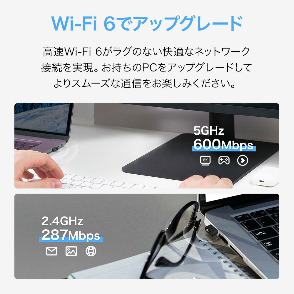 高速接続:最大900Mbps(287Mbps:2.4GHz&600Mbps:5GHz)の11ax Wi-Fiにアップグレード可能です。 デュアルバンド対応:2.4GHzと5GHzバンドが柔軟な接続を可能にし、手軽にデバイスを快適なWi-Fi 6にアップグレードします。 Bluetooth 5.3:信頼性と安全性が向上したBluetooth 5.3を搭載し、 ゲームコントローラー・ヘッドホン・キーボード等とより安定した接続が可能です。 ナノデザイン:ノートPCに挿したままでも邪魔にならず、持ち運びにも便利です。 対応OS:Windows 11/10に対応しています。 高セキュリティ:WEP・WPA/WPA2/WPA3・WPA-PSK/WPA2-PSK・ WPA3-SAE暗号化に対応しています。