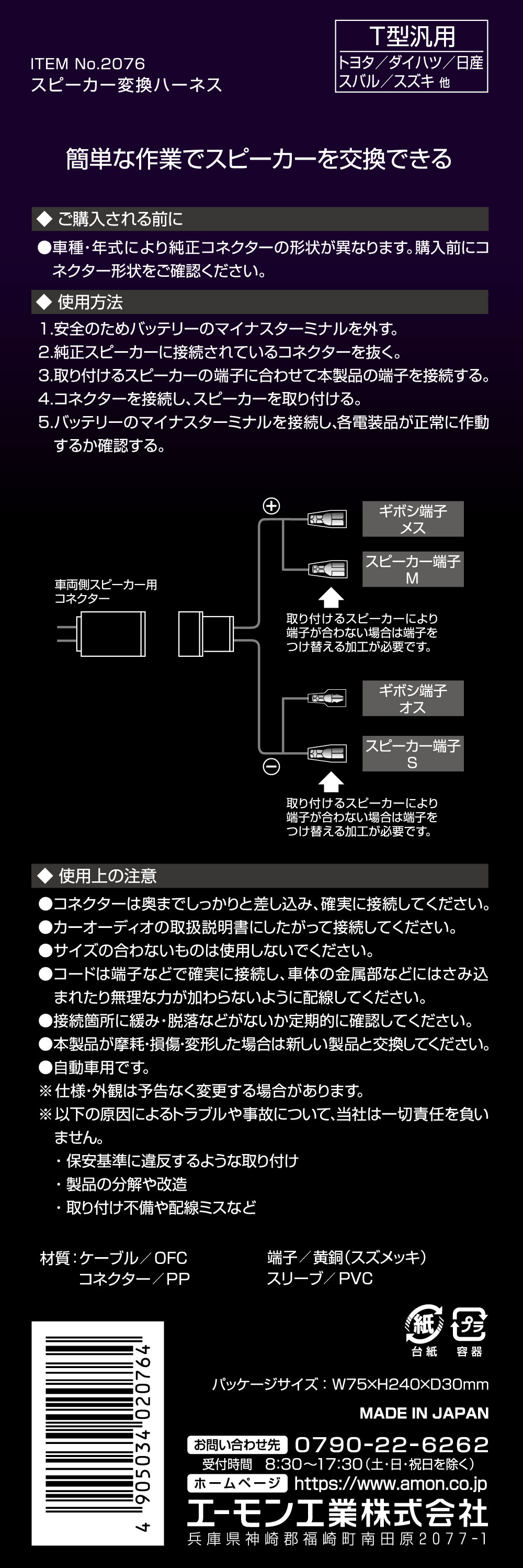 エーモン工業 2076 スピーカー変換ハーネス T型汎用 スピーカー変換ハーネス スピーカー交換 ギボシ付き 挿し変えるだけの便利アイテム 一部スバル車スピーカー変換ハーネス 一部スズキ車スピーカー変換ハーネス