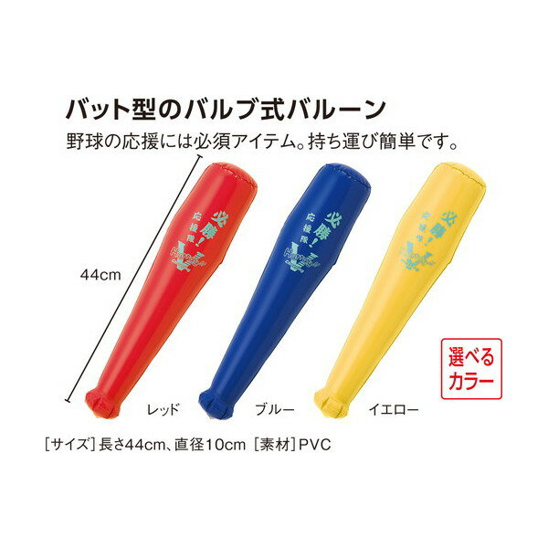■こちらの商品は、現在「お取り寄せ」になっております。ご注文から発送まで「3から7営業日」を目安にお考えください。■注文が集中した場合など、発送が遅れたり、在庫切れで販売できなくなる可能性がございます。欠品、納期遅れなどにつきましては、個別にご案内させていただきます。メーカー欠品中の場合は、通常よりお時間を頂戴する場合がございます。その際は、個別に改めてご案内申し上げます。※メーカーが土日祭日が休みの為、すぐに在庫確認を行えない場合もございます。 ※上記、予めご了承の上、ご注文くださいますようお願い致します。 メーカー希望小売価格はメーカーカタログに基づいて掲載しています カタログデータは↑コチラ↑をクリックでご確認頂けます。※当商品は、交換・返品などの対応をさせて頂くことができません。 予めご了承の上でお買い求めくださいますようお願い致します。【商品説明】商品本体サイズ(高さ×幅×奥行):長さ44×直径10cm素材・材質:PVCバット型のバルブ式バルーン。野球の応援には必須アイテム。持ち運び簡単です。