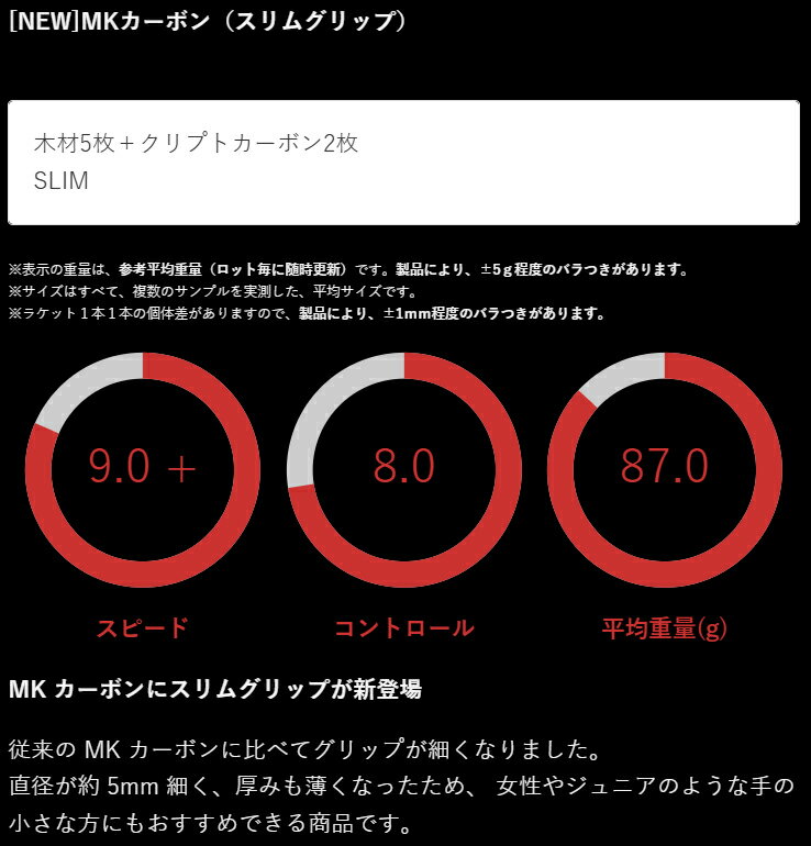 ■こちらの商品は、現在「お取り寄せ」になっております。ご注文から発送まで「3〜7営業日」を目安にお考えください。■注文が集中した場合など、発送が遅れたり、在庫切れで販売できなくなる可能性がございます。欠品、納期遅れなどにつきましては、個別にご案内させていただきます。■メーカー欠品中の場合は、それ以上お時間を頂く場合がございますが、その場合につきましては、別途個別にご案内差し上げます。※メーカーが土日祭日が休みの為、すぐに在庫確認を行えない場合もございます。予めご了承の上、ご注文くださいますようお願い致します。 メーカー希望小売価格はメーカーカタログに基づいて掲載しています カタログデータは↑コチラ↑をクリックでご確認頂けます。【商品説明】MKカーボン(スリムグリップ)MK カーボンにスリムグリップが新登場従来のMKカーボンに比べてグリップが細くなりました。直径が約5mm 細く、厚みも薄くなったため、女性やジュニアのような手の小さな方にもおすすめできる商品です。木材5枚+クリプトカーボン2枚SLIMグリップスピード 9.0 +コントロール 8.0平均重量(g) 87.0※表示の重量は、参考平均重量(ロット毎に随時更新)です。製品により、±5g程度のバラつきがあります。※サイズはすべて、複数のサンプルを実測した、平均サイズです。※ラケット1本1本の個体差がありますので、製品により、±1mm程度のバラつきがあります。