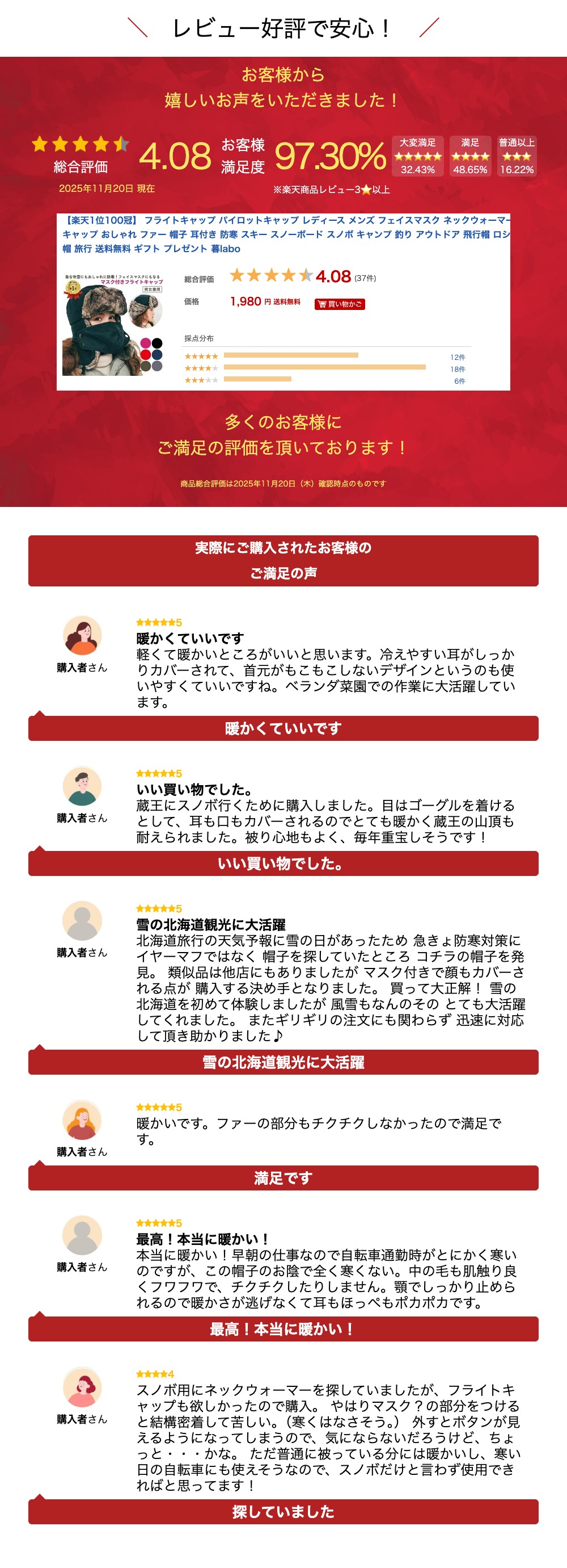 商品詳細 素材 ポリエステル サイズ フリーサイズ コメント 頭、耳、顔周りをしっかり防寒出来るネックウォーマー。 防寒対策の必需品!! しっかりフィット&優れた付け心地♪ マスク部分は簡単に取り外し可能。 耳当て部分は折ってバックルでとめてベレー帽風にアレンジできます。 スノーボード、サイクリングなどのスポーツ・アウトドアにもおすすめ! 注意事項 ●モニターの色と実際の色が異なることがございます。あらかじめご了承ください。 ●お客様都合による返品交換は受け付けておりません。あらかじめご了承ください。 ※写真は展示例・イメージです ※端末・モニターの環境により、実際の商品と多少色の見え方が異なる場 合があります。あらかじめご了承ください ※平置き採寸の為、サイズは多少の誤差が生じる場合がございます ※輸入品のため、多少の傷や汚れ等はご承諾の上ご購入をよろしくお願い致します ※商品は、本体のみの簡易包装で出荷します。予めご了承ください ※配送状況によりおとどけが遅れる場合がございます。予めご了承ください ※商品の性質上サイズが合わない等での交換・返品はお受けしておりません。予めご了承ください ※配送期間終了から3週間が経過した場合の未着問い合わせはいかなる場合でも対応はお受けしかねます。予めご了承ください ※商品改良のため、予告なく一部デザイン・カラー等仕様が変更になる場合がございます。予めご了承ください ※予め十分ご確認の上、ご注文頂きますようお願い申し上げます。 検索キーワード 【楽天1位】 フライトキャップ パイロットキャップ レディース メンズ フェイスマスク ネックウォーマー キャップ おしゃれ ファー 帽子 耳付き 防寒 スキー スノーボード スノボ キャンプ 釣り アウトドア 飛行帽 ロシア帽 旅行 送料無料 ギフト プレゼント ポイント消化 ※ ご購入の際のご注意 ※ 【1】商品お届けのタイミング ※各商品ページに記載しております納期情報を必ずご確認宜しくお願い致します。 ※予約商品に関しましては納期情報に「予約」の記載がございますので必ずご確認宜しくお願い致します。 【2】お使いのモニター環境、撮影場所やイメージにより実際の商品と色味が若干異なる場合がございます。 製品不良以外での返品交換は受け付けておりません。 あらかじめご了承下さいませ。 【3】製品により多少の誤差が生じる場合がございます。 生産時期により、商品のタグ。ボタンなどまれに変更されている場合がございます。 ※ お問い合わせに関しまして ※ 商品・配送などに関するお問合わせは、行き違いによるトラブル防止のため、原則としてメール・お問合わせフォームにてお願い致します。 (お電話はお調べする時間や聞き違いなどご迷惑をおかけする可能性がございます) 合わせてメールが届かない等による苦情を防ぐ為、以下の文面を記載致します。 当店からの連絡が届かない場合 ドメイン拒否・ドメイン指定受信を設定されている場合は当店のメールアドレス 「sensemarket.rakuten@gmail.com」を受信できるように設定して下さい。 お客様が迷惑メール設定をしていなくても、プロバイダの設定で自動で迷惑メールフォルダへ振り分けられる場合がございます。お手数ですが迷惑メールフォルダ内のご確認を宜しくお願い致します。 ※ 簡易包装でのお届けについて ※ 当店では無駄な梱包材を減らすことで、環境に配慮する観点から簡易包装にて商品をお届けしております。 簡易包装に何卒ご理解ご協力を賜りますようお願い申し上げます。 なお一部商品に関しまして販売価格を維持する為、圧縮包装でのお届けとなりますので予めご了承下さいませ。 ※ 保管期間超過・住所不備による返送に関しまして ※ 不在時やポストに入らない等で、各運送会社の不在連絡票が入ることがございます。 その際は保管期間内に再配達依頼をお願い致します。 ご連絡されずに当店に返送されてきた場合の再出荷は返送料及び再出荷送料を頂戴致しますのでご了承下さいませ。 なお配送先のご住所不備による変更に関しましても同様のご対応となります。 当店では長期不在・住所不備等により配送できずに戻ってきたお荷物の保管期限を、出荷完了後2週間とさせて頂いております。 期限を過ぎたお荷物は処分させていただく形になりますのでご注意ください。その場合の再出荷・返金対応は致しかねます。