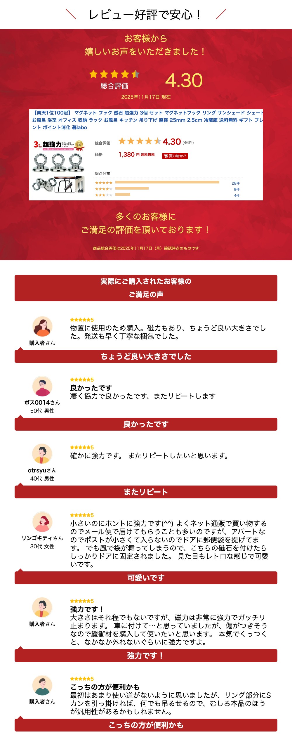 商品詳細 素材 磁石面:磁石 リング部分:ステンレス サイズ リング内径:約1.3cm 磁石面直径:約2.5cm 高さ:約3cm 垂直最大荷重:約14kg ※耐荷重はメーカーテスト環境時のあくまで参考数値となります。 ※設置面の素材・環境により変動しますのでご使用の際は安全面を十分確保の上ご使用下さい。 ※商品の使用により生じた損害等の補償は一切お受けしかねますので予めご承諾の上お買い求め下さい。 コメント 超強力!マグネットフックです。ネオジム磁石なので、さまざまな物を引っ掛け収納できます。 玄関周りの小物やキッチン周りも便利に使用できます。 オフィスでも最大限に活用できます。 注意事項 ●モニターの色と実際の色が異なることがございます。あらかじめご了承ください。 ●お客様都合による返品交換は受け付けておりません。あらかじめご了承ください。 ※写真は展示例・イメージです ※端末・モニターの環境により、実際の商品と多少色の見え方が異なる場 合があります。あらかじめご了承ください ※平置き採寸の為、サイズは多少の誤差が生じる場合がございます ※輸入品のため、多少の傷や汚れ等はご承諾の上ご購入をよろしくお願い致します ※商品は、本体のみの簡易包装で出荷します。予めご了承ください ※配送状況によりおとどけが遅れる場合がございます。予めご了承ください ※商品の性質上サイズが合わない等での交換・返品はお受けしておりません。予めご了承ください ※配送期間終了から3週間が経過した場合の未着問い合わせはいかなる場合でも対応はお受けしかねます。予めご了承ください ※商品改良のため、予告なく一部デザイン・カラー等仕様が変更になる場合がございます。予めご了承ください ※予め十分ご確認の上、ご注文頂きますようお願い申し上げます。 検索キーワード マグネット フック マグネットフック 磁石 キッチン用具 壁掛けフック 強力磁石 超強力 天井フック キッチン用品 壁付けフック ビニールカーテン ふきんかけ 金具 壁 傷つけない 超強力マグネットフック マグネットバー 粘着フック シャワーフック お風呂 ドアフック 吸盤 超強力磁石 マグネットクリップ マグネット収納 強力マグネットフック キッチンツールフック 壁掛け タオル掛け 鍵かけ 玄関 ふっく 風呂 タオルかけ ゴミ袋 レンジフード お風呂収納 壁掛け収納 フック付き磁石 マグネットキーフック 鍵置き キーフック 便利 便利グッズ ※ ご購入の際のご注意 ※ 【1】商品お届けのタイミング ※各商品ページに記載しております納期情報を必ずご確認宜しくお願い致します。 ※予約商品に関しましては納期情報に「予約」の記載がございますので必ずご確認宜しくお願い致します。 【2】お使いのモニター環境、撮影場所やイメージにより実際の商品と色味が若干異なる場合がございます。 製品不良以外での返品交換は受け付けておりません。 あらかじめご了承下さいませ。 【3】製品により多少の誤差が生じる場合がございます。 生産時期により、商品のタグ。ボタンなどまれに変更されている場合がございます。 ※ お問い合わせに関しまして ※ 商品・配送などに関するお問合わせは、行き違いによるトラブル防止のため、原則としてメール・お問合わせフォームにてお願い致します。 (お電話はお調べする時間や聞き違いなどご迷惑をおかけする可能性がございます) 合わせてメールが届かない等による苦情を防ぐ為、以下の文面を記載致します。 当店からの連絡が届かない場合 ドメイン拒否・ドメイン指定受信を設定されている場合は当店のメールアドレス 「sensemarket.rakuten@gmail.com」を受信できるように設定して下さい。 お客様が迷惑メール設定をしていなくても、プロバイダの設定で自動で迷惑メールフォルダへ振り分けられる場合がございます。お手数ですが迷惑メールフォルダ内のご確認を宜しくお願い致します。 ※ 簡易包装でのお届けについて ※ 当店では無駄な梱包材を減らすことで、環境に配慮する観点から簡易包装にて商品をお届けしております。 簡易包装に何卒ご理解ご協力を賜りますようお願い申し上げます。 なお一部商品に関しまして販売価格を維持する為、圧縮包装でのお届けとなりますので予めご了承下さいませ。 ※ 保管期間超過・住所不備による返送に関しまして ※ 不在時やポストに入らない等で、各運送会社の不在連絡票が入ることがございます。 その際は保管期間内に再配達依頼をお願い致します。 ご連絡されずに当店に返送されてきた場合の再出荷は返送料及び再出荷送料を頂戴致しますのでご了承下さいませ。 なお配送先のご住所不備による変更に関しましても同様のご対応となります。 当店では長期不在・住所不備等により配送できずに戻ってきたお荷物の保管期限を、出荷完了後2週間とさせて頂いております。 期限を過ぎたお荷物は処分させていただく形になりますのでご注意ください。その場合の再出荷・返金対応は致しかねます。