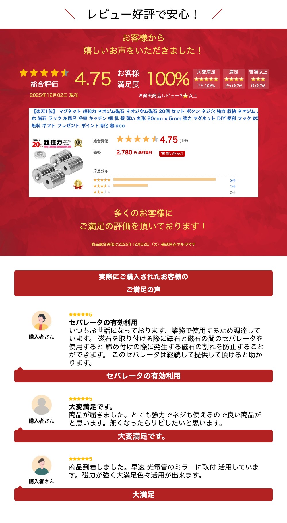 商品詳細 素材磁石素材:ネオジム サイズ 直径20mm 厚さ5mm コメント シンプルで使いやすい! マグネット 磁石20個セット 小さくて薄いのに、とても強力な磁石です。 印刷物を止めるにも、邪魔になりません。 冷蔵庫、ホワイトボード、キッチンに。 注意事項 ●モニターの色と実際の色が異なることがございます。あらかじめご了承ください。 ●お客様都合による返品交換は受け付けておりません。あらかじめご了承ください。 ※写真は展示例・イメージです ※端末・モニターの環境により、実際の商品と多少色の見え方が異なる場 合があります。あらかじめご了承ください ※平置き採寸の為、サイズは多少の誤差が生じる場合がございます ※輸入品のため、多少の傷や汚れ等はご承諾の上ご購入をよろしくお願い致します ※商品は、本体のみの簡易包装で出荷します。予めご了承ください ※配送状況によりおとどけが遅れる場合がございます。予めご了承ください ※商品の性質上サイズが合わない等での交換・返品はお受けしておりません。予めご了承ください ※配送期間終了から3週間が経過した場合の未着問い合わせはいかなる場合でも対応はお受けしかねます。予めご了承ください ※商品改良のため、予告なく一部デザイン・カラー等仕様が変更になる場合がございます。予めご了承ください ※予め十分ご確認の上、ご注文頂きますようお願い申し上げます。 ※ ご購入の際のご注意 ※ 【1】商品お届けのタイミング ※各商品ページに記載しております納期情報を必ずご確認宜しくお願い致します。 ※予約商品に関しましては納期情報に「予約」の記載がございますので必ずご確認宜しくお願い致します。 【2】お使いのモニター環境、撮影場所やイメージにより実際の商品と色味が若干異なる場合がございます。 製品不良以外での返品交換は受け付けておりません。 あらかじめご了承下さいませ。 【3】製品により多少の誤差が生じる場合がございます。 生産時期により、商品のタグ。ボタンなどまれに変更されている場合がございます。 ※ お問い合わせに関しまして ※ 商品・配送などに関するお問合わせは、行き違いによるトラブル防止のため、原則としてメール・お問合わせフォームにてお願い致します。 (お電話はお調べする時間や聞き違いなどご迷惑をおかけする可能性がございます) 合わせてメールが届かない等による苦情を防ぐ為、以下の文面を記載致します。 当店からの連絡が届かない場合 ドメイン拒否・ドメイン指定受信を設定されている場合は当店のメールアドレス 「sensemarket.rakuten@gmail.com」を受信できるように設定して下さい。 お客様が迷惑メール設定をしていなくても、プロバイダの設定で自動で迷惑メールフォルダへ振り分けられる場合がございます。お手数ですが迷惑メールフォルダ内のご確認を宜しくお願い致します。 ※ 簡易包装でのお届けについて ※ 当店では無駄な梱包材を減らすことで、環境に配慮する観点から簡易包装にて商品をお届けしております。 簡易包装に何卒ご理解ご協力を賜りますようお願い申し上げます。 なお一部商品に関しまして販売価格を維持する為、圧縮包装でのお届けとなりますので予めご了承下さいませ。 ※ 保管期間超過・住所不備による返送に関しまして ※ 不在時やポストに入らない等で、各運送会社の不在連絡票が入ることがございます。 その際は保管期間内に再配達依頼をお願い致します。 ご連絡されずに当店に返送されてきた場合の再出荷は返送料及び再出荷送料を頂戴致しますのでご了承下さいませ。 なお配送先のご住所不備による変更に関しましても同様のご対応となります。 当店では長期不在・住所不備等により配送できずに戻ってきたお荷物の保管期限を、出荷完了後2週間とさせて頂いております。 期限を過ぎたお荷物は処分させていただく形になりますのでご注意ください。その場合の再出荷・返金対応は致しかねます。 注目キーワード マグネット マグネットフック 強力マグネットフック マグネット収納 マグネットリング 超強力マグネット 強力磁石 ネオジム磁石 ネオジウム磁石 ネオジム ネオジウム 磁石 磁石シート強力 フック ワイド 丸 丸型(シルバー) 円柱 棒 リング ボタン 収納 収納小物 書類 ファイル メモ チラシ ポスター 置き配 便利グッズ シンプル インテリア アンティーク おしゃれ かわいい 可愛い 北欧 キッチン お風呂 風呂 浴室 レンジフード レンジガード ホワイトボード 冷蔵庫 玄関 玄関ドア 網戸 カーテン 窓 バー タオルかけ タオル インターホン 文具 実験 事務所 仕事 協力 使いやすい 持ちやすい 浮く 猫 棚 鍵 壁 黒 金属製 ステンレス 超強力 強力 大容量 小さい 長方形 薄型 貼れる はがせる 両面 大 2kg 10kg 20mm 10mm×2mm に セット 新生活 お知らせ 風よけ 棒 実験 マグネット フック 磁石 キッチン用具 壁掛けフック 強力磁石 超強力 天井フック キッチン用品 壁付けフック ビニールカーテン ふきんかけ 