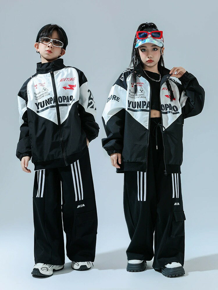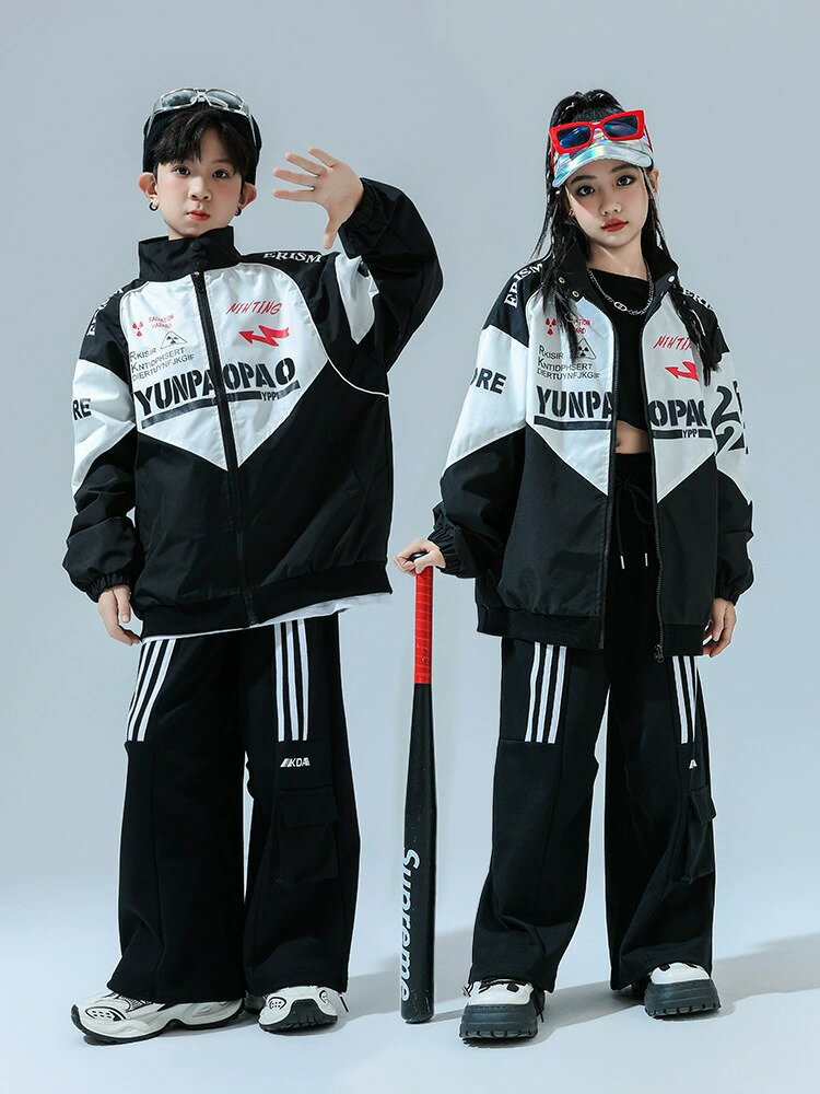 野球風 ベースボールシャツ ジャケット ダンス衣装 キッズ ブラック スポーツウェア 子供服 ヒップホップ セットアップ 女の子 男の子 かっこいい 長袖 チアガール ストリート系 派手 舞台衣装 発表会 個性派 演出服 練習着 舞台服 団体服 個性派 イベント ダンス110-180cm