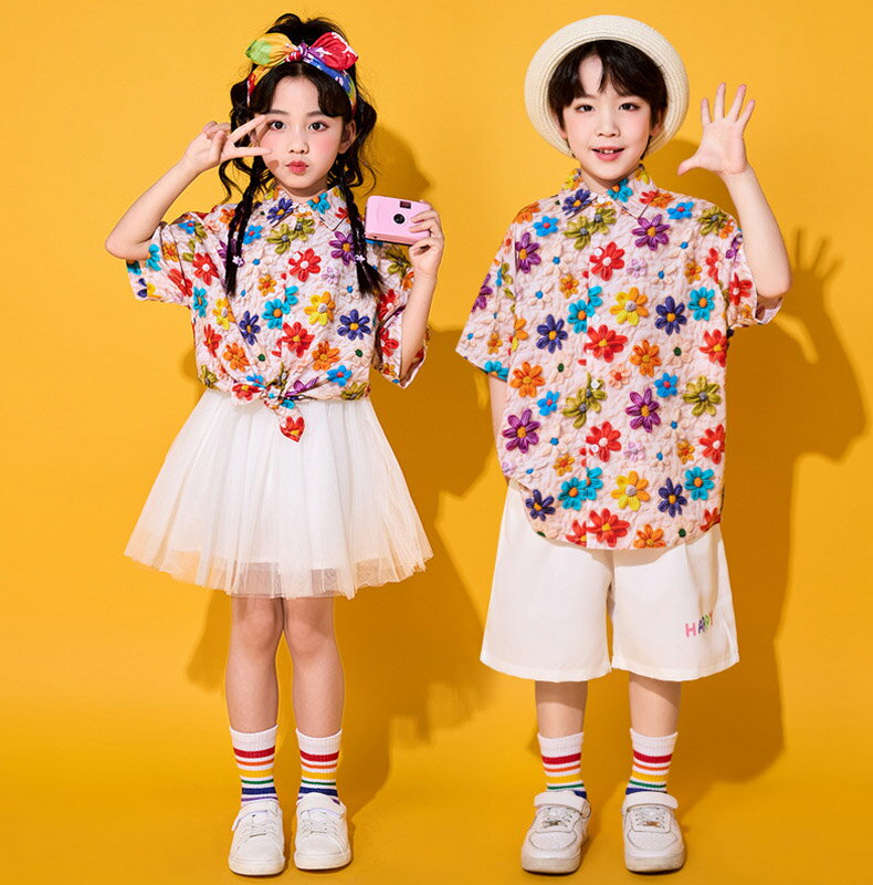 花柄シャツ ベージュ ホワイト ミニスカート チアガール キッズ ダンス 衣装 子供服 可愛い 半袖 トップス メッシュスカート 短パン ショーツ 女の子 男の子 HIPHOP JAZZ 派手 幼稚園 応援団 発表会 舞台服 個性派 K-POP 演出服 練習着 団体服 ステージ衣装 110-180cm