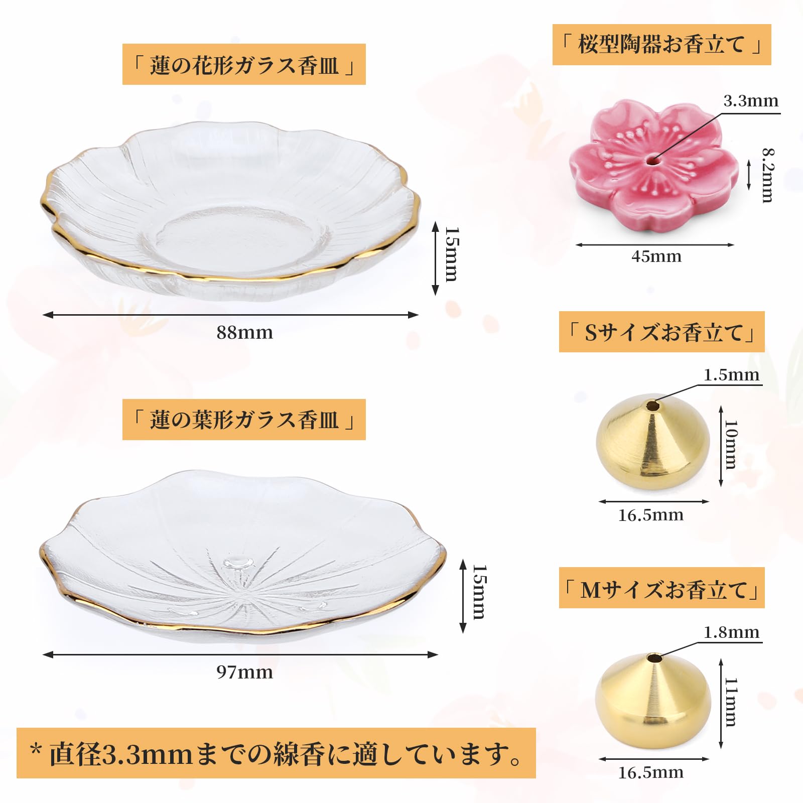 商品情報商品の説明商品説明主な仕様 【セット内容・仕様】内容物:蓮の葉ガラス製香皿+蓮の花ガラス製香皿+桜型ホルダー+Sサイズ真鍮水滴ホルダー+Mサイズ真鍮水滴ホルダー+箒 蓮の葉香皿サイズ:88mm*15mm 蓮の花香皿サイズ:97mm*15mm 桜ホルダーサイズ:約外径寸法 45mm 内径寸法:3.3mm Sサイズ真鍮水滴ホルダー:約外径寸法 16.5mm*10mm 内径:1.5mm Mサイズ真鍮水滴ホルダー:約外径寸法 16.5mm*11mm* 内径:1.8mmbr【おしゃれなお香皿とホルダー3個セット】シンプルな和風デザインと高品質なガラス製お香皿と香玉のセットです。香玉が固定ではないので、お香の位置も変えられるので便利です。部屋の雰囲気またはその日の気分、お好みによってお香を挿し香玉の色を3タイプから選べることができます。桜と水滴の2種類展開で置き場所を選ばず、どこでも気軽にお香を楽しめます。【灰の飛散らなし】一般的なインセンスホルダーとは異なり、灰を周囲に散らばらせません。下部に受け皿があるため、同梱されるブラシを使用して香皿の灰を掃除して、落ちた灰の掃除が便利で、実用的なインセンスホルダーです。デザインだけでなく機能性にも優れているので、ぜひ試してみてください。また、水洗い可能なので清潔にお使いいただけます。【色々な用途&使用場所】床の間や和室のインテリアに、癒やし空間創りのフロマグッズ、ヨガの練習、茶道、瞑想でご使いください。使用場所は寝室、玄関、書斎だけではなく、仏堂、旅館、カフェ、茶室、図書館、オフィスでもさりがない香りを演出します。空気の浄化、疲労軽減、ストレス緩和、集中力の高まり、健康の効果になります。【Segartyの品質】不良対応はもちろん、「使いづらい」「イメージと違った」など、どのような理由でも返品・交換を受け付けます。お気軽にお試してください。