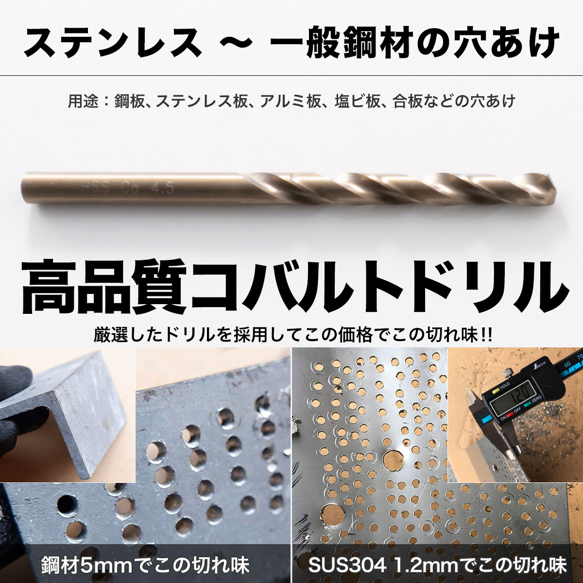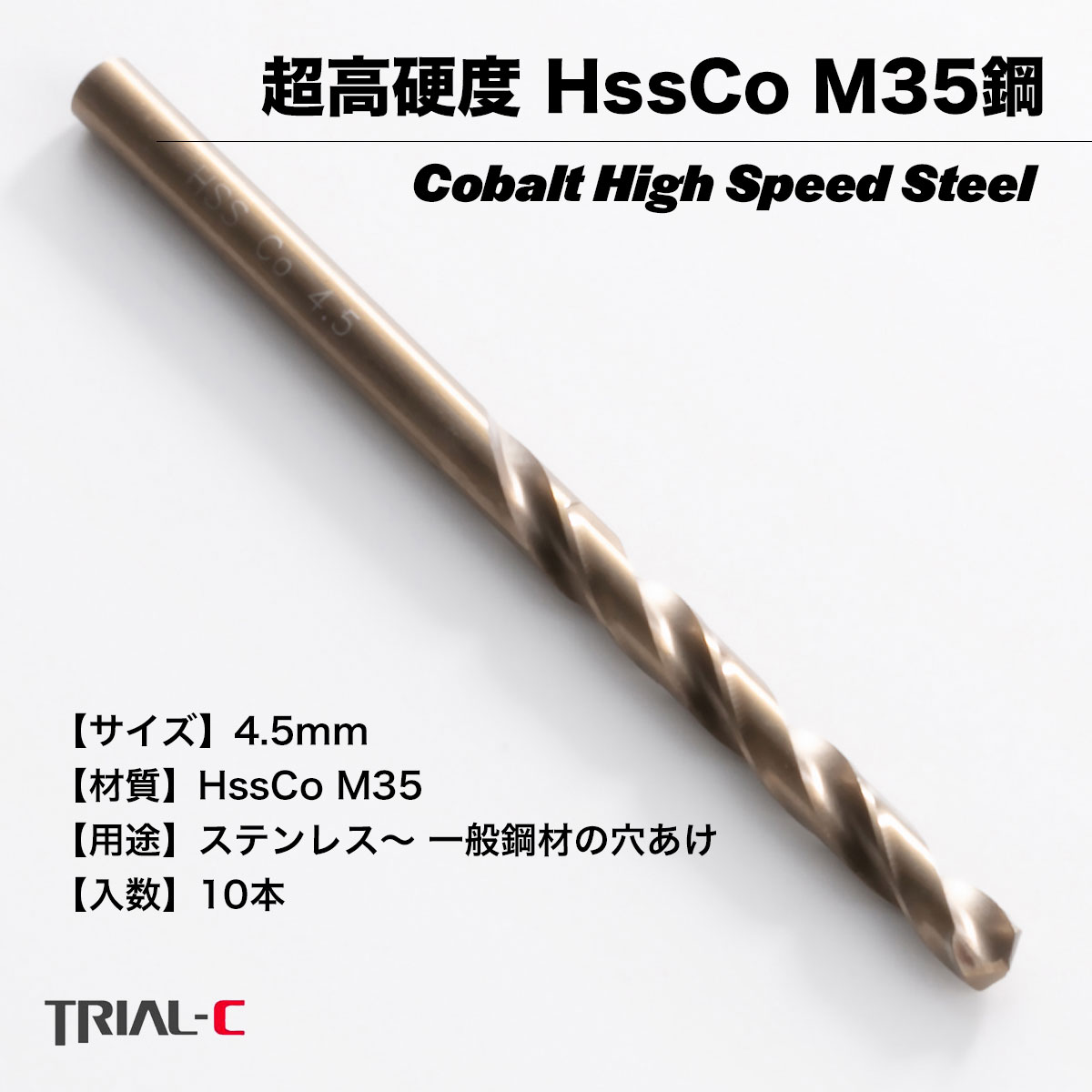 コバルトドリル 4.5mm ステンレス用ドリル 10本組 ステンレス・鉄工用 コバルトハイス ドリル ストレートドリル キリ 丸軸 鉄工用ドリル 穴あけ 電動ドライバー ボール盤