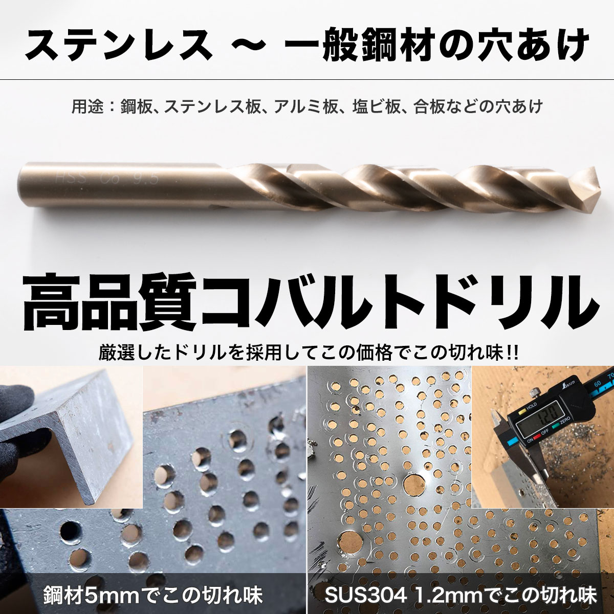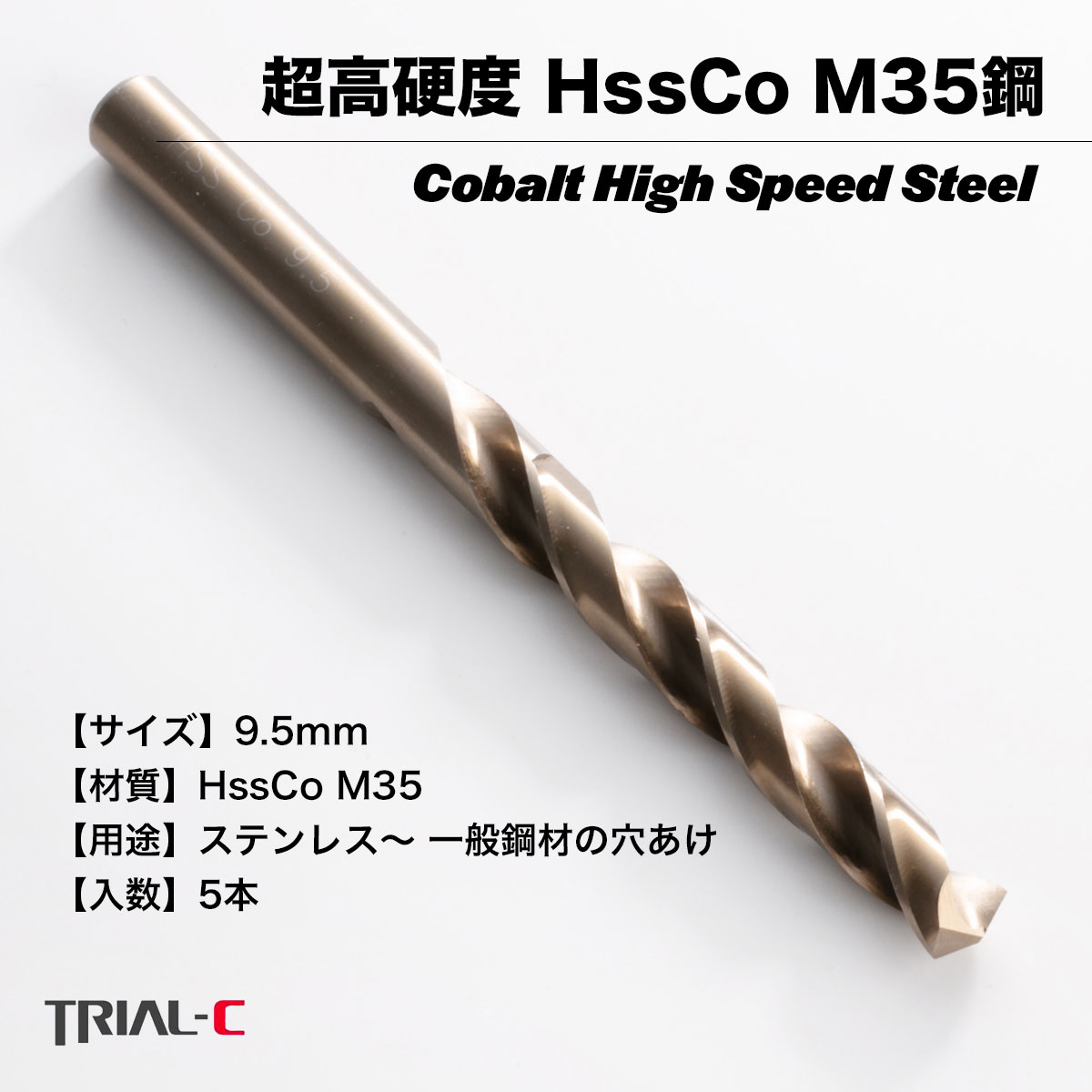 コバルトドリル 9.5mm ステンレス用ドリル 5本組 ステンレス・鉄工用 コバルトハイス ドリル ストレートドリル キリ 丸軸 鉄工用ドリル 穴あけ 電動ドライバー ボール盤