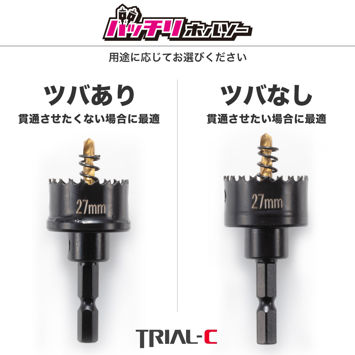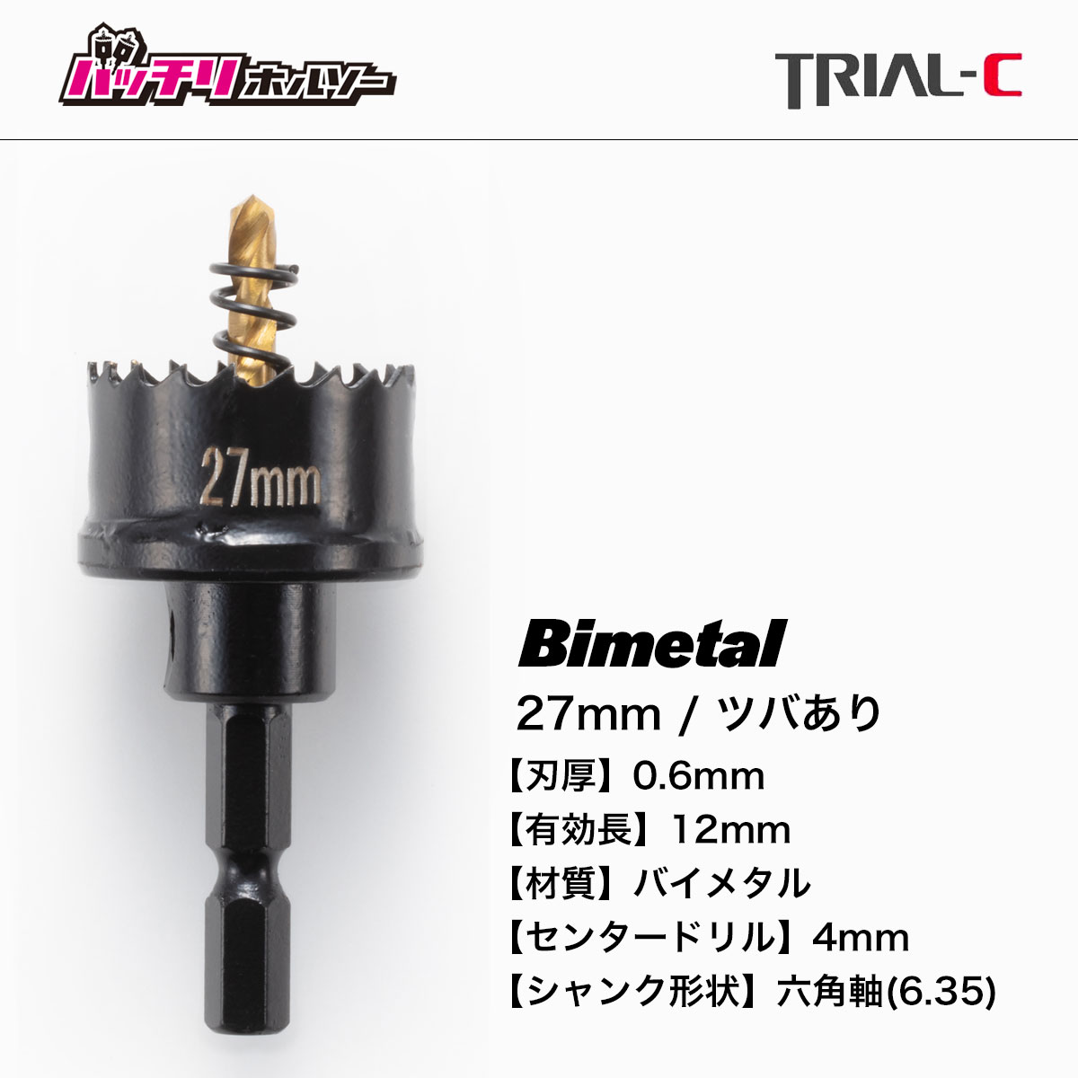 商品情報・スペック 商品27mm ツバあり 仕様刃厚:0.6mm 有効長:12mm材質:バイメタルセンタードリル:4mmシャンク形状:六角軸(6.35) 用途ステンレス(0.6mm)薄鉄板(1.6mm)アルミ塩ビ板FRP木材 適合機種充電ドリルインパクトドライバー電気ドリル サイズ27mm 六角軸でご利用できるインパクト用の薄刃仕様のホールソー27ミリ。 電気工事業者様の使用頻度が多い27mm10本!!万が一センタードリルが折れたりしてもセンタードリルのみ交換可能。刃厚0.6mmで有名ホルソーメーカーと遜色ない切れ味と耐久性を実現。
