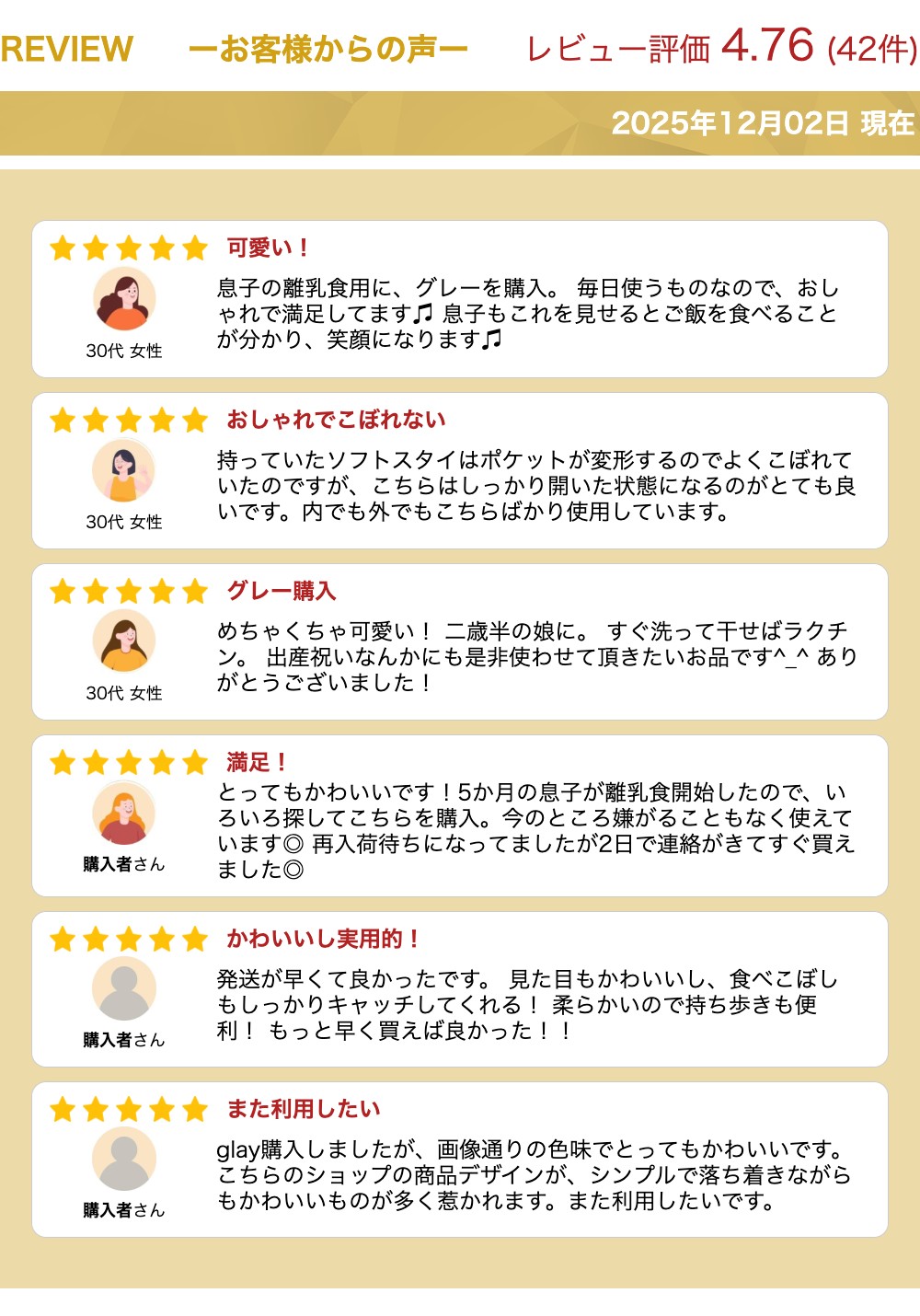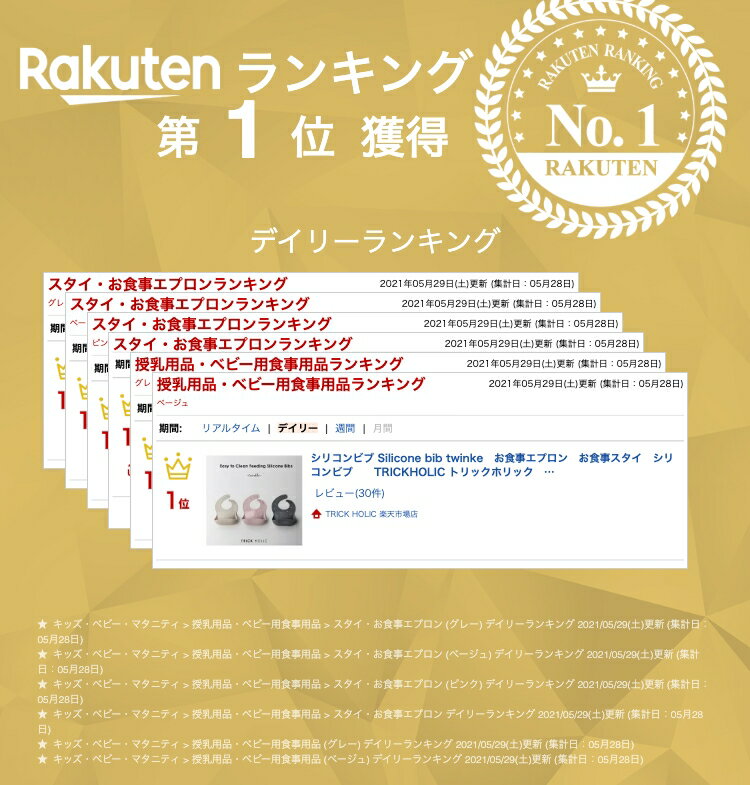 【禁止事項】TRICKHOLICでは転売、再販売、その他営利を目的として商品を購入する行為は禁止しております。 TRICKHOLICのブランケットやアイテムに似合うお色味と、TRICKHOLICの定番柄、星で製作しました。 素材:シリコーンゴム 食洗機:使用可能 対象年齢:6ヶ月 サイズ:本体 約縦30*22.5cm 首回り:約25?31cm Made in China お子様のおなかに沿ったカーブと、腕を動かしやすいようシェイプされたサイド部分など着用しやすいデザインです。 柔らかく弾力のあるシリコン素材でくるくると丸めて収納が可能。かさばらずに持ち運びできます。 汚れにくく耐久性がありお手洗いが簡単です。 大きめポケットが食べこぼしをキャッチし胸元の汚れを防ぎます。 ※シリコンの性質上、細かいほこりやゴミが付着しやすい為、食用洗剤でしっかり洗ってからのご使用をお願いします。 ※素材自体に黒い点のようなものがつく場合がございますが製造上避けられませんため、不良品ではござません。 関連商品【1点までネコポス可】シリコンビブ Silicone bib cher...【11/29 11時頃再入荷】【1点までネコポス可】シリコンビブ Si...2,000円2,200円【1点までネコポス可】almondmilk bear未定 TRICK ...《楽天スーパーセール 半額》TRICK HOLIC Silicone ...2,200円1,350円【11/19 PM4時頃再入荷 vintage flower】【1点ま...【11/19 PM4時頃再入荷】6重ガーゼブランケット星月・くま・レモ...6,800円5,600円《楽天スーパーセール 半額》TRICK HOLIC vintage b...《楽天スーパーセール 半額》TRICK HOLIC Silicone ...1,450円1,350円ゴールドの刺繍糸。6重ガーゼブランケット星と月の刺繍 Sサイズ(約70...【10点までネコポス可】TRICK HOLIC オリジナル ネームタグ...5,600円2,300円シリコンお食事エプロン***流行のおしゃぶりや食器のカラーの合うよう、くすみカラーで製作し、TRICKHOLICのメイン柄、星をモチーフにしたお食事エプロンができました。BPA・フタル酸・PVC不使用の100%シリコーン素材で食洗機もお使いいただけます。柔らかく、持ち運びも簡単なのでおでかけ時にもお使いいただけます。