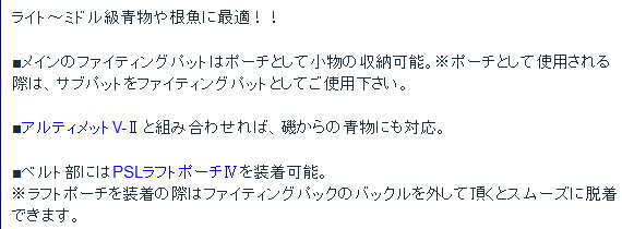 ※当店在庫切れの場合:お取り寄せ納期2〜7日頂いております。 当店在庫品につきましては、土日祝日を除き1〜3日程で発送となります。在庫切れで商品がお取り寄せとなりました場合、2〜7日以内に発送出来る様に努めさせていただいております。お急ぎの際は、事前にメールまたはお電話にて、お問合わせ下さい。 在庫管理には十分注意しておりますが、ご注文タイミングにより、万が一当店・メーカー共に在庫欠品の場合には、ご連絡の上キャンセルさせていただくことがございますので何卒ご了承ください。ライト〜ミドル級青物や根魚に最適!! ■メインのファイティングパットはポーチとして小物の収納可能。※ポーチとして使用される際は、サブパットをファイティングパットとしてご使用下さい。 ■アルティメットV-2と組み合わせれば、磯からの青物にも対応。 ■ベルト部にはPSLラフトポーチ〓を装着可能。 ※ラフトポーチを装着の際はファイティングパックのバックルを外して頂くとスムーズに脱着できます。
