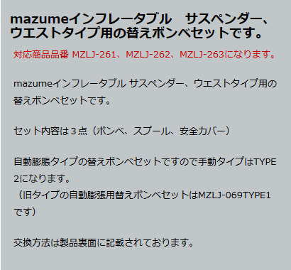 ※当店在庫切れの場合:お取り寄せ納期2〜7日頂いております。 当店在庫品につきましては、土日祝日を除き1〜3日程で発送となります。在庫切れで商品がお取り寄せとなりました場合、2〜7日以内に発送出来る様に努めさせていただいております。お急ぎの際は、事前にメールまたはお電話にて、お問合わせ下さい。 在庫管理には十分注意しておりますが、ご注文タイミングにより、万が一当店・メーカー共に在庫欠品の場合には、ご連絡の上キャンセルさせていただくことがございますので何卒ご了承ください。対応商品品番 MZLJ-261、MZLJ-262、MZLJ-263になります。 mazumeインフレータブル サスペンダー、ウエストタイプ用の替えボンベセットです。 セット内容は3点(ボンベ、スプール、安全カバー) 自動膨脹タイプの替えボンベセットですので手動タイプはTYPE 2になります。 (旧タイプの自動膨張用替えボンベセットはMZLJ-069TYPE1です) 交換方法は製品裏面に記載されております。