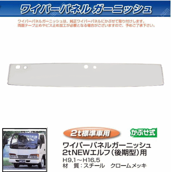 ワイパーパネルガーニッシュ NEWエルフ標準用 後期型H9.1〜H16 〈材質:スチール製クロームメッキ仕上げ〉 〈規格:NEWエルフ後期型標準車H9.1~16.5〉 〈パッケージサイズ: 横1340mm×縦240mm×奥行80mm〉 〈取付方法:かぶせ式〉 〈入数:1セット〉 ※後期型用になります。 お車の年式をご確認ください。 ※純正にかぶせて取り付けします。 ★★個人のお客様への重要なお知らせ!★★ こちらの商品は大型商品になりますので個人宅への配送を行っておりません。 個人のお客様でも配送先が運送業者営業所止め、自動車整備工場、ガソリンスタンド、カーディーラー、勤務先など 屋号が付いている住所であれば、ご注文可能です。不明点がある場合はお気軽にご相談ください。