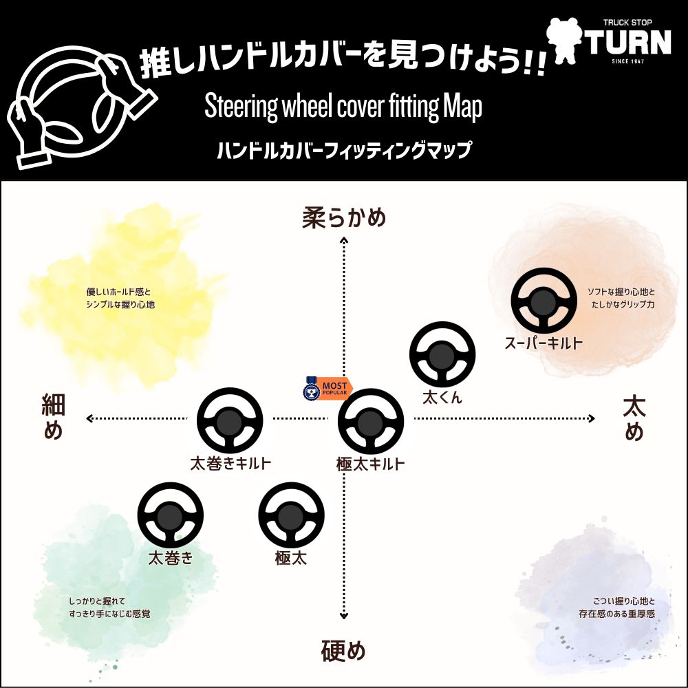 太さ 約33mm(極太より細い) 純正に近い雰囲気の生地 握り心地・グリップ向上 快適性アップ・疲労軽減 国内自社工場生産 丈夫・高い耐久力 受注製作 プレゼントに最適 〈ターン製ハンドルカバーの特徴〉 他社にはない太さをラインナップし、様々な価値観で商品を選択することができます。 安心安全を考え、軽自動車からトラックまで業界最多の7〜9サイズを用意しています。 握り心地やグリップ力の向上から運転の疲労を軽減、快適で安全なドライブを提案します。 耐久力が高いので長期的なコストパフォーマンスは抜群、愛着をもって長く使えます。 トラックパーツ業界で培われた長年の信頼と実績に裏打ちされた品質を誇ります。 ご注文を頂いてから国内自社工場にて1本1本縫製させて頂きます。 〈サイズや太さについて〉 太さ:およそ33mm(極太より細い) 適合:軽自動車~トラックまで サイズの確認はこちらから 〈ご注意事項〉 こちらの商品は受注製作になります。(ご注文確定後、1本1本縫製させて頂きます) お届けの目安:ご注文確定後、およそ9〜12日です。(メールにてご案内いたします) お届け方法:宅配便(佐川急便または日本郵便) 原則、ご注文後のキャンセルや注文内容の変更は受け付けておりません。 原則、返品や交換についても受け付けておりません。 最新の商品状況を表示するよう心がけてますが、欠品・廃番の場合もございます。 こちらの商品は下記項目で検索されています金華山 デコトラ トラック おしゃれ 飾り 派手 王朝 黒 白 金 灰色 ブラック ホワイトブラック ゴールド グレー フソー FUSO 三菱 日野 HINO いすず いすゞ ISUZU イスズ UD 日産 軽四 軽自動車 軽トラ トヨタ マツダ 17スーパーグレート 07スーパーグレート 2000 ベストワンファイター ニューファイター NEW フルコンファイター 20キャンター ブルーテックキャンター Bキャンター ジェネレーションキャンター ニューキャンター Gキャンター 17プロフィア エアループプロフィア グランドプロフィア Gプロフィア プロフィアテラヴィ 17レンジャー レンジャープロ デュトロ エアループデュトロ ファイブスターギガ Fギガ GIGA 07ギガ ギガ 23フォワード 07フォワード フォワード 320 23エルフ 07エルフ PMエルフ NEWエルフ エルフ 17クオン パーフェクトクオン クオン ビッグサム フレンズコンドル ファインコンドル ダンプ S SW サイズ 日本製 国産 長持ち 疲れにくい 握りやすい 太い 細い かっこいい かわいい
