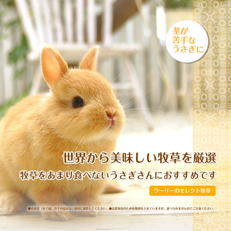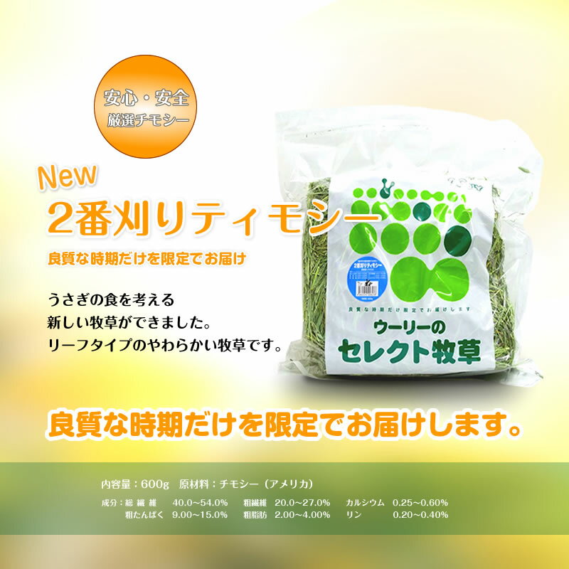 ●内容量 600g ●素材・原材料 チモシー(アメリカ産) ●成分・カロリー 粗たんぱく質 6.5%以上 粗脂肪 1.5%以上 粗繊維 32.0%以下 水分 11.0%以下 粗灰分 9.0%以下 リン 0.40%以下 カルシウム 0.60%以下 ●メーカー ウーリー ●対象 うさぎ ※自然物ですので、ロット毎に風味や色、成分は変動することがございます。 ※不良品以外(食べないなどの理由により)の返品交換は受け付けておりません。世界から美味しい牧草をお届け! ウーリーのセレクト牧草シリーズは世界から美味しい牧草を厳選し良質な牧草のみを使用しています。 セレクト牧草「2番刈りティモシー」はリーフタイプの柔らかい牧草です。 牧草をあまり食べない、硬い茎が苦手なうさぎにオススメです。