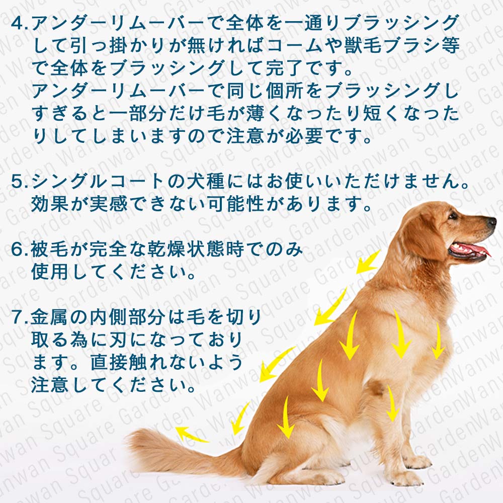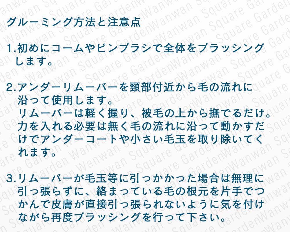 グルーミング方法と注意点 1.初めにコームやピンブラシで全体をブラッシングします 2.アンダーリムーバーを頸部付近から毛の流れに沿って使用します 柄は軽く握り、被毛の上から撫でるだけ 力を入れる必要は無く毛の流れに沿って動かすだけでアンダーコートや小さい毛玉を取り除いてくれます 3.リムーバーが毛玉等に引っかかった場合は無理に引っ張らずに、絡まっている毛の根元を片手でつかんで皮膚が直接引っ張られないように気を付けながら再度ブラッシングをして下さい 4.アンダーリムーバーで全体を一通りブラッシングして引っ掛かりが無ければコームや獣毛ブラシ等で全体をブラッシングして完了です アンダーリムーバーで同じ個所をブラッシングしすぎると一部分だけ毛が薄くなったり短くなったりするので注意が必要です 5.シングルコートの犬種にはお使いいただけません。効果が実感できない可能性があります 6.被毛が完全な乾燥状態時でのみ使用してください 7.金属の内側部分は毛を切り取る為に刃になっております 直接触れないよう注意してください ※皮膚に湿疹、疾患や怪我、傷などがある場合は使用しないでくださいグルーミング方法と注意点 1.初めにコームやピンブラシで全体をブラッシング します。 2.アンダーリムーバーを頸部付近から毛の流れに 沿って使用します。 リムーバーは軽く握り、被毛の上から撫でるだけ。 力を入れる必要は無く毛の流れに沿って動かすだ けでアンダーコートや小さい毛玉を取り除いてく れます。 3.リムーバーが毛玉等に引っかかった場合は無理に 引っ張らずに、絡まっている毛の根元を片手でつ かんで皮膚が直接引っ張られないように気を付け ながら再度ブラッシングを行って下さい。 4.アンダーリムーバーで全体を一通りブラッシング して引っ掛かりが無ければコームや獣毛ブラシ等 で全体をブラッシングして完了です。 アンダーリムーバーで同じ個所をブラッシングし すぎると一部分だけ毛が薄くなったり短くなった りしてしまいますので注意が必要です。 5.シングルコートの犬種にはお使いいただけません。 効果が実感できない可能性があります。 6.被毛が完全な乾燥状態時でのみ使用してください。 7.金属の内側部分は毛を切り取る為に刃になっており ます。直接触れないよう注意してください ※皮膚に湿疹、疾患や怪我、傷などがある場合は使用しないでください。 素材:竹、ステンレス 〈検索用ワード〉 犬 ハーネス 犬用ハーネス 犬のハーネス 名前 おしゃれ かわいい 犬との暮らし 犬と一緒に お散歩 アウトドア マルチ 海 川 山 老犬 引っ張り 一体型 軽い 軽量 ブランド 犬のハーネスバックル金具 抜けない 着用しやすい 簡単着脱 ワンタッチ 強い 丈夫 長持ち 安全 抜けにくい 新型 犬 リード 犬用リード おしゃれ 2頭引き 多頭引き ダブルリード ツインリード ウェイビング 強い 長持ち 肩掛け 外れ 防止 ロープ 伸縮 丈夫 軽量 使いやすい メッシュ 軽い カラフル 丈夫 安心 ダブル かわいい 小型犬 中型犬 大型犬 犬 首輪 犬用首輪 犬の首輪 おしゃれ 名入れ かわいい 革 丈夫 軽い メッシュ ワンタッチ アジャスター 調節 小型犬 中型犬 大型犬 抜けない 抜けにくい ナイロン製 高級素材 コーデュラ 丈夫 強化プラスチック 金属 鍛造 ワンタッチ 通気性 メッシュ 使いやすい 安心 世界68ヵ国愛用 人気商品 イチオシ商品 信頼のTruelove 流行 バズる バズってる SNS Tiktokで人気 インスタ キレイ パピー 子犬 ウォーキング ジョギング マラソン チワワ トイプー トイプードル テリア パピヨン グリフォン ポメ ポメラニアン マルチーズ ヨークシャテリア 豆しば 豆柴 ダックスフンド ウェルシュテリア イタグレ シーズー シェットランドシープドッグ ジャックラッセルテリア チベタン チン パグ ビションフリーゼ ペキニーズ ボストンテリア ミニチュアシュナウザー シュナ ミニチュアダックス ミニピン ミニチュアピンシャー ワイヤーフォックステリア アメリカンコッカースパニエル アメコカ ピットブル ウィペット コーギー ケルピー 甲斐犬 紀州犬 四国犬 北海道犬 シャーペイ ジャーマンピンシャー スピッツ バセットハウンド パセンジー ビーグル フレンチブルドッグ フレブル ブリタニースパニエル ブルドッグ デーン シープドッグ ボーダーコリー ブルテリア アイリッシュウルフハウンド アイリッシュセッター 秋田犬 アフガンハウンド マラミュート イングリッシュセッター ポインター エアデールテリア グレートデン ピレニーズ ゴールデンレトリバー サモエド サルーキ シベリアンハスキー シェパード スタンダードプードル スタンプー セントバーナード ダルメシアン チャウチャウ 土佐犬 ドーベルマン ニューファンドランド ニューファン バーニーズ コリー フラットコーテッドレトリバー レオンベルガー ロットワイラー ワイマラナー ラブラドールレトリーバー ラフコリー
