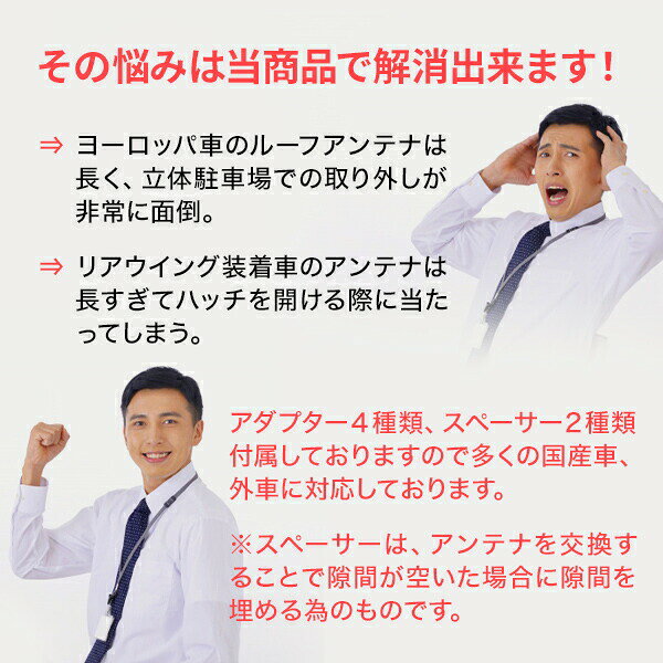 汎用リアルブラックカーボンショートアンテナです。ラインの美しいシームレスタイプ。立体駐車場の車庫入れ、洗車時にアンテナの長さを気にせずに済むユーロスタイルのショートアンテナです。特にヨーロッパ車のルーフアンテナは長いものが付いており、立体駐車場に入る際は取り外さないといけず、非常に面倒。リアウイング装着車でアンテナが長すぎてハッチを開ける際にアンテナに当たってしまう。その悩みは当商品で解消出来ます!アダプター4種類、スペーサー2種類付属しておりますので多くの国産車、外車に対応しております。※スペーサーは、アンテナを交換することで隙間が空いた場合に隙間を埋める為のものです。【商品詳細】アンテナ全長(約)8 1本M5のアダプター3種類 各1本M6のアダプター1種類 1本ゴムスペーサー高さ4、6 各1個※汎用品となりますが、一部適合しない車種もございます。商品のサイズ等を十分にご確認ください。【注意事項を予めご了承ください】 ●入荷時期により、若干デザインや仕様が変わる場合がございます。 ●手作業での採寸となりますので、若干の誤差が生じます。 ●輸入品のため、小傷・擦れ・汚れ・変形・ヘコミ・縫製のムラ等などが付いている場合があります。 ●取扱・取付説明書等は付属しておりません。 ●販売のみとなりますため、取扱・取付方法のお問い合わせ等は対応不可となります。 ●当商品を使用した事による他商品の破損・故障につきましては一切の責任を負いかねます。 ●作業中の事故・取付ミスによる破損に関しましては一切の責任を負いません。 ●お使いのモニター環境や撮影場所やイメージにより、実際の商品と色味が若干異なる場合がございます。汎用リアルブラックカーボンショートアンテナです。ラインの美しいシームレスタイプ。立体駐車場の車庫入れ、洗車時にアンテナの長さを気にせずに済むユーロスタイルのショートアンテナです。特にヨーロッパ車のルーフアンテナは長いものが付いており、立体駐車場に入る際は取り外さないといけず、非常に面倒。リアウイング装着車でアンテナが長すぎてハッチを開ける際にアンテナに当たってしまう。その悩みは当商品で解消出来ます!アダプター4種類、スペーサー2種類付属しておりますので多くの国産車、外車に対応しております。※スペーサーは、アンテナを交換することで隙間が空いた場合に隙間を埋める為のものです。【商品詳細】アンテナ全長(約)8 1本M5のアダプター3種類 各1本M6のアダプター1種類 1本ゴムスペーサー高さ4、6 各1個※汎用品となりますが、一部適合しない車種もございます。商品のサイズ等を十分にご確認ください。【注意事項を予めご了承ください】 ●入荷時期により、若干デザインや仕様が変わる場合がございます。 ●手作業での採寸となりますので、若干の誤差が生じます。 ●輸入品のため、小傷・擦れ・汚れ・変形・ヘコミ・縫製のムラ等などが付いている場合があります。 ●取扱・取付説明書等は付属しておりません。 ●販売のみとなりますため、取扱・取付方法のお問い合わせ等は対応不可となります。 ●当商品を使用した事による他商品の破損・故障につきましては一切の責任を負いかねます。 ●作業中の事故・取付ミスによる破損に関しましては一切の責任を負いません。 ●お使いのモニター環境や撮影場所やイメージにより、実際の商品と色味が若干異なる場合がございます。