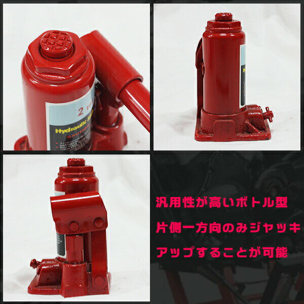 汎用性が高いボトル型のジャッキ。片側一方向のみジャッキアップすることができます。【商品詳細】・最大荷重:2トン・本体重量:約2.3・アジェスティング高:約48までの高さ調整可能(ネジ式にて高さ調整可能)・リフティング高:約80・最小高:約148・最大高:約276【注意事項を予めご了承ください】 ●入荷時期により、若干デザインや仕様が変わる場合がございます。 ●手作業での採寸となりますので、若干の誤差が生じます。 ●輸入品のため、小傷・擦れ・汚れ・変形・ヘコミ・縫製のムラ等などが付いている場合があります。 ●取扱・取付説明書等は付属しておりません。 ●販売のみとなりますため、取扱・取付方法のお問い合わせ等は対応不可となります。 ●当商品を使用した事による他商品の破損・故障につきましては一切の責任を負いかねます。 ●作業中の事故・取付ミスによる破損に関しましては一切の責任を負いません。 ●お使いのモニター環境や撮影場所やイメージにより、実際の商品と色味が若干異なる場合がございます。汎用性が高いボトル型のジャッキ。片側一方向のみジャッキアップすることができます。【商品詳細】・最大荷重:2トン・本体重量:約2.3・アジェスティング高:約48までの高さ調整可能(ネジ式にて高さ調整可能)・リフティング高:約80・最小高:約148・最大高:約276【注意事項を予めご了承ください】 ●入荷時期により、若干デザインや仕様が変わる場合がございます。 ●手作業での採寸となりますので、若干の誤差が生じます。 ●輸入品のため、小傷・擦れ・汚れ・変形・ヘコミ・縫製のムラ等などが付いている場合があります。 ●取扱・取付説明書等は付属しておりません。 ●販売のみとなりますため、取扱・取付方法のお問い合わせ等は対応不可となります。 ●当商品を使用した事による他商品の破損・故障につきましては一切の責任を負いかねます。 ●作業中の事故・取付ミスによる破損に関しましては一切の責任を負いません。 ●お使いのモニター環境や撮影場所やイメージにより、実際の商品と色味が若干異なる場合がございます。