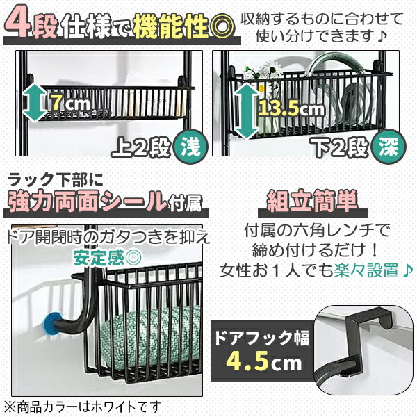 ドアに掛けるだけ!簡単な設置で収納力UP!ウォールポケット♪■デッドスペースが収納スペースに使える収納スペースが少なく、部屋に小物が散らかりがちな方小物の定位置として、片付ける場所を増やしましょう!■リビング、シャワールーム、子供部屋にと、ドアがある場所に引っ掛けるだけ!おもちゃや化粧品、リモコンやタオルなど、使い方は自由自在!使い方はあなた次第!サイズに合うものは何でも収納出来ちゃいます♪■シンプルなデザインどんな系統のインテリアにも相性抜群!■深さは2種類、4ポケットの機能性上2段は浅め、下2段は深めの作りで、収納するものに合わせて仕分けてお使いいただけます。■付属の六角レンチで締め付けるだけ!お客様の方での組み立て作業が必要になりますが、とっても簡単です♪女性お一人でも余裕で設置が可能!【商品詳細】サイズ(約):横43cm×高さ106cm×奥行き16.5cm重量(約):1.6kg1段辺りの耐荷重量(約):2kg材質:炭素鋼【カラー】ホワイト【注意事項を予めご了承ください】●入荷時期により、若干デザインや仕様が変わる場合がございます。●手作業での採寸となりますので、若干の誤差が生じます。●輸入品のため、小傷・擦れ・汚れ・変形・ヘコミ・縫製のムラ等などが付いている場合があります。●取扱・取付説明書等は付属しておりません。●販売のみとなりますため、取扱・取付方法のお問い合わせ等は対応不可となります。●当商品を使用した事による他商品の破損・故障につきましては一切の責任を負いかねます。●作業中の事故・取付ミスによる破損に関しましては一切の責任を負いません。●お使いのモニター環境や撮影場所やイメージにより、実際の商品と色味が若干異なる場合がございます。0 ぬいぐるみウォールポケット コレクションケースドアに掛けるだけ!簡単な設置で収納力UP!ウォールポケット♪■デッドスペースが収納スペースに使える収納スペースが少なく、部屋に小物が散らかりがちな方小物の定位置として、片付ける場所を増やしましょう!■リビング、シャワールーム、子供部屋にと、ドアがある場所に引っ掛けるだけ!おもちゃや化粧品、リモコンやタオルなど、使い方は自由自在!使い方はあなた次第!サイズに合うものは何でも収納出来ちゃいます♪■シンプルなデザインどんな系統のインテリアにも相性抜群!■深さは2種類、4ポケットの機能性上2段は浅め、下2段は深めの作りで、収納するものに合わせて仕分けてお使いいただけます。■付属の六角レンチで締め付けるだけ!お客様の方での組み立て作業が必要になりますが、とっても簡単です♪女性お一人でも余裕で設置が可能!【商品詳細】サイズ(約):横43cm×高さ106cm×奥行き16.5cm重量(約):1.6kg1段辺りの耐荷重量(約):2kg材質:炭素鋼【カラー】ホワイト【注意事項を予めご了承ください】●入荷時期により、若干デザインや仕様が変わる場合がございます。●手作業での採寸となりますので、若干の誤差が生じます。●輸入品のため、小傷・擦れ・汚れ・変形・ヘコミ・縫製のムラ等などが付いている場合があります。●取扱・取付説明書等は付属しておりません。●販売のみとなりますため、取扱・取付方法のお問い合わせ等は対応不可となります。●当商品を使用した事による他商品の破損・故障につきましては一切の責任を負いかねます。●作業中の事故・取付ミスによる破損に関しましては一切の責任を負いません。●お使いのモニター環境や撮影場所やイメージにより、実際の商品と色味が若干異なる場合がございます。0