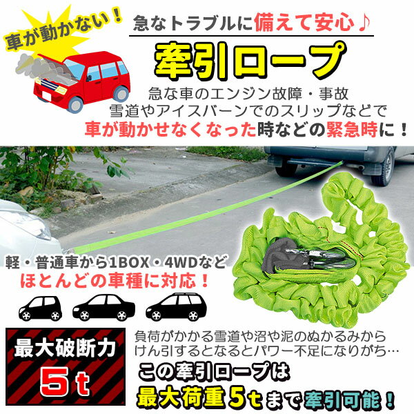 急な車のエンジン故障や事故、雪道やアイスバーンでのスリップなどで万が一、車が動かせなくなった時などの緊急時も、トランクの中に1つ常備するだけでトラブルの際も安心です。通常の車両重量だけでも軽自動車で1t弱、普通車のセダンなどで1〜1.5t、大型のミニバンやSUVでは2t前後といわれています。負荷がかかる雪道や、沼や泥のぬかるみからけん引するとなると、パワー不足になりがちですが、この牽引ロープはなんと最大荷重5tまで可能。ほとんどの車種を対応できる優れものです。【特徴】・普通乗用車から1BOX・4WDのけん引に最適です。・ワッカ型フック、カギ型フック、アイボルト型フックに使用可能です。・脱輪、バッテリー上がり、ガス欠など様々なトラブルに便利なけん引ロープです。・軽量でコンパクトなので収納にも場所を選びません。【商品詳細】長さ(約):203cm重さ(約):1.22kg(袋なしの場合0.9kg)材 質:ポリエステル最大破断力:5t対応車種:家庭用の7席&7席以下の車、ビジネス用7席車 ※ピックアップトラック含めず【注意事項を予めご了承ください】●入荷時期により、若干デザインや仕様が変わる場合がございます。●手作業での採寸となりますので、若干の誤差が生じます。●輸入品のため、小傷・擦れ・汚れ・変形・ヘコミ・縫製のムラ等などが付いている場合があります。●取扱・取付説明書等は付属しておりません。●販売のみとなりますため、取扱・取付方法のお問い合わせ等は対応不可となります。●当商品を使用した事による他商品の破損・故障につきましては一切の責任を負いかねます。●作業中の事故・取付ミスによる破損に関しましては一切の責任を負いません。●お使いのモニター環境や撮影場所やイメージにより、実際の商品と色味が若干異なる場合がございます。急な車のエンジン故障や事故、雪道やアイスバーンでのスリップなどで万が一、車が動かせなくなった時などの緊急時も、トランクの中に1つ常備するだけでトラブルの際も安心です。通常の車両重量だけでも軽自動車で1t弱、普通車のセダンなどで1〜1.5t、大型のミニバンやSUVでは2t前後といわれています。負荷がかかる雪道や、沼や泥のぬかるみからけん引するとなると、パワー不足になりがちですが、この牽引ロープはなんと最大荷重5tまで可能。ほとんどの車種を対応できる優れものです。【特徴】・普通乗用車から1BOX・4WDのけん引に最適です。・ワッカ型フック、カギ型フック、アイボルト型フックに使用可能です。・脱輪、バッテリー上がり、ガス欠など様々なトラブルに便利なけん引ロープです。・軽量でコンパクトなので収納にも場所を選びません。【商品詳細】長さ(約):203cm重さ(約):1.22kg(袋なしの場合0.9kg)材 質:ポリエステル最大破断力:5t対応車種:家庭用の7席&7席以下の車、ビジネス用7席車 ※ピックアップトラック含めず【注意事項を予めご了承ください】●入荷時期により、若干デザインや仕様が変わる場合がございます。●手作業での採寸となりますので、若干の誤差が生じます。●輸入品のため、小傷・擦れ・汚れ・変形・ヘコミ・縫製のムラ等などが付いている場合があります。●取扱・取付説明書等は付属しておりません。●販売のみとなりますため、取扱・取付方法のお問い合わせ等は対応不可となります。●当商品を使用した事による他商品の破損・故障につきましては一切の責任を負いかねます。●作業中の事故・取付ミスによる破損に関しましては一切の責任を負いません。●お使いのモニター環境や撮影場所やイメージにより、実際の商品と色味が若干異なる場合がございます。