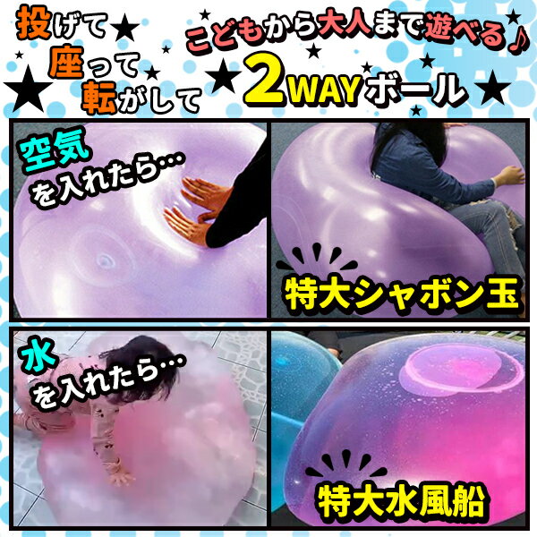 SNSで話題!バルブボールが登場!!空気をいれたら特大シャボン玉になり、水を入れたら特大水風船にもなります♪こどもから大人まで遊べる2WAYボール!■乗っても割れないふしぎなボール!投げて、座って、転がして、遊び方は無限大!!■直径最大約120cm!!変幻自在の特大ボール空気や水を入れて最大120cmまで膨らむ!用途に合わせてお好きなサイズに調整することも可能です。■やわらかTPR素材傷や衝撃に強い丈夫なTRP素材を使用、乗ったり座ったりしても破れにくく、いろんな遊び方が楽しめます♪空気の入れ方※空気入れの棒は付属していますが入れにくい場合は専用の空気入れをご用意ください。1、中に空気が入るように本体を上下左右に引っ張ってほぐします。2、吸入口を内側から指で押して弁を外に出します3、空気穴に空気入れの先を挿入します。4、空気を入れる5、空気でいっぱいになった後、空気穴を中に押し込みます。水風船の入れ方※カッターとホースをご用意ください。1、空気穴を見つける2、1cmカッターで切れ目を入れる3、ホースを挿入します4、水を入れる5、水でいっぱいになった後、空気穴を中心に押し込む商品名:バブルボール材質:TPR重量:約0.4サイズは約100〜120ぐらいなりますカラー:ピンク※空気入れ棒付き【注意事項を予めご了承ください】●入荷時期により、若干デザインや仕様が変わる場合がございます。●手作業での採寸となりますので、若干の誤差が生じます。●輸入品のため、小傷・擦れ・汚れ・変形・ヘコミ等などが付いている場合があります。●取扱・取付説明書等は付属しておりません。●販売のみとなりますため、取扱・取付方法のお問い合わせ等は対応不可となります。●当商品を使用した事による他商品の破損・故障につきましては一切の責任を負いかねます。●作業中の事故・取付ミスによる破損に関しましては一切の責任を負いません。●お使いのモニター環境や撮影場所やイメージにより、実際の商品と色味が若干異なる場合がございます。SNSで話題!バルブボールが登場!!空気をいれたら特大シャボン玉になり、水を入れたら特大水風船にもなります♪こどもから大人まで遊べる2WAYボール!■乗っても割れないふしぎなボール!投げて、座って、転がして、遊び方は無限大!!■直径最大約120cm!!変幻自在の特大ボール空気や水を入れて最大120cmまで膨らむ!用途に合わせてお好きなサイズに調整することも可能です。■やわらかTPR素材傷や衝撃に強い丈夫なTRP素材を使用、乗ったり座ったりしても破れにくく、いろんな遊び方が楽しめます♪空気の入れ方※空気入れの棒は付属していますが入れにくい場合は専用の空気入れをご用意ください。1、中に空気が入るように本体を上下左右に引っ張ってほぐします。2、吸入口を内側から指で押して弁を外に出します3、空気穴に空気入れの先を挿入します。4、空気を入れる5、空気でいっぱいになった後、空気穴を中に押し込みます。水風船の入れ方※カッターとホースをご用意ください。1、空気穴を見つける2、1cmカッターで切れ目を入れる3、ホースを挿入します4、水を入れる5、水でいっぱいになった後、空気穴を中心に押し込む商品名:バブルボール材質:TPR重量:約0.4サイズは約100〜120ぐらいなりますカラー:ピンク※空気入れ棒付き【注意事項を予めご了承ください】●入荷時期により、若干デザインや仕様が変わる場合がございます。●手作業での採寸となりますので、若干の誤差が生じます。●輸入品のため、小傷・擦れ・汚れ・変形・ヘコミ等などが付いている場合があります。●取扱・取付説明書等は付属しておりません。●販売のみとなりますため、取扱・取付方法のお問い合わせ等は対応不可となります。●当商品を使用した事による他商品の破損・故障につきましては一切の責任を負いかねます。●作業中の事故・取付ミスによる破損に関しましては一切の責任を負いません。●お使いのモニター環境や撮影場所やイメージにより、実際の商品と色味が若干異なる場合がございます。