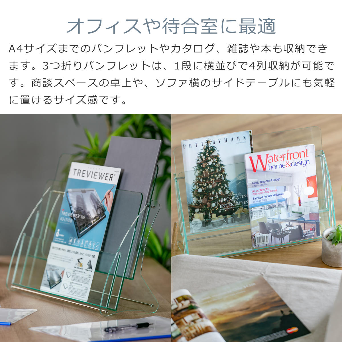 サイズ 商品説明 1 透明ガラス色が美しい、アクリル製の卓上パンフレットスタンドです。カタログやパンフレット、会社案内などが収納できて、カウンターや待合室、エントランスの卓上に設置できます。高級感のあるアクリル製のシンプルなデザインは、どんなインテリアにも馴染みやすいです。 2 A4サイズまでのパンフレットやカタログ、雑誌や本も収納できます。3つ折りパンフレットは、1段に横並びで4列収納が可能です。商談スペースの卓上や、ソファ横のサイドテーブルにも気軽に置けるサイズ感です。 3 収納部分は段になっているので、後ろに収納したものも見やすく取り出しやすいです。 4 側面の板はゆるやかなカーブを描いたデザインになっています。また、角の部分は全て丸くカットされているので安全にお使いいただけます。 5 留め具のネジはアクリル板の中に入るような造りになっているので、凸凹のないフラットな側面です。 6 お客様組み立て商品です。アクリル板を組み合わせ、付属の六角レンチを使用して簡単に組み立てることができます。 商品仕様 品名 パンフレットスタンド A4判2列2段 製品コード 004-220 サイズ 約 幅43.2×奥行14.1×高さ31.5(cm) 素材 アクリル 生産国 日本製 キーワード: パンフレットスタンド A4判 2列2段 アクリル製 日本製 クリア パンフレット カタログ 雑誌 本 チラシ 冊子 収納 スタンド ケース 台 卓上 アクリル 透明 オフィス 待合室 会社 商談スペース 簡単組立 おしゃれ 高 パンフレットスタンド A4判2列2段 004-220