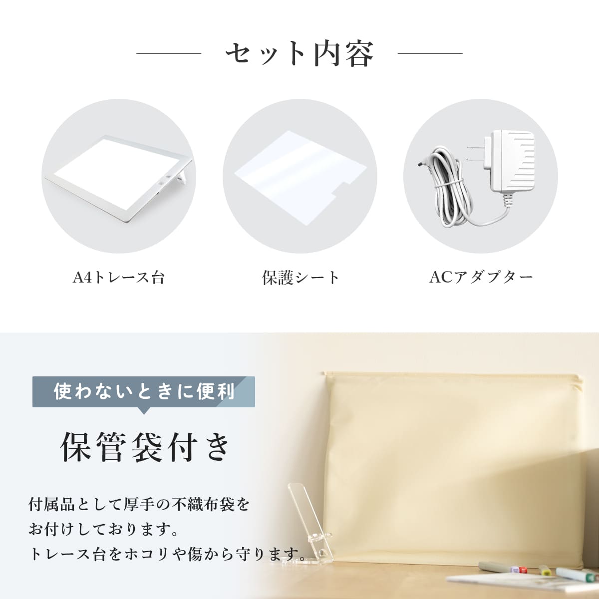 商品説明 1 プロの声から生まれたトレース台です。安心の日本製、3年保証付きです。 2 電源にLEDを使用しているため、約40,000時間の寿命があります。そのため、ランプの交換はできません。 3 天板はアクリルの1枚板を使用しているため、継ぎ目、段差がなく、用紙を傷めることがありません。 4 厚さが薄いため、場所を取りません。薄くて軽く収納、持ち運びにも便利です。 5 天板傾斜角度が3段階に調整できますので長時間のトレース作業にも疲れません。収納する場合は脚を折りたためます。 6 ご使用方法によりスタンドが不要の場合はプラスドライバーでスタンド取り付け左右各2本のネジを取り外すこともでき、再度取り付ける事もできます。 7 タッチセンサーによるON/OFF、7段階の調光機能、照度1000〜5300ルクスの間を7段階で変化ができ、スイッチを切っても、再度スイッチをONすると元のOFFした明るさで点灯します。 商品仕様 品名 A4 薄型LEDトレース台 ホワイト 保護シート付 製品コード A4-500-W-01 サイズ 約 幅35×奥行26.2×厚さ0.8(ゴム脚厚:0.2、スタンド込み:2.5)(cm) 重量 900g 消費電力 5W コードの長さ 2m 内容量 1台付属品:ACアダプター(AC100V〜240V DC12V1A)1個、専用保護シート1枚、厚手不織布袋1枚、保証書付き説明書 備考 ※メーカー3年保証付【本体】透写範囲:約 幅21×奥行29.7 (cm)適応用紙:A4判光源:LED色温度6500〜7000ケルビン光源寿命:約40000時間中央部の明るさ:1000〜5300ルクス調光機能:7段階(タッチセンサー式)傾斜角度:4度/13度/17度【専用保護シート】素材:透明アクリル樹脂 厚み:1mm 両面テープ付き キーワード: TREVIEWER450-500 トレース台 A4 薄型LED トレビュアー グレー 保護シート付 A4 A4-500-W-01 TREVIEWER日本製 7段階調光 3年保証 軽量 縦置き ライトボード トレース 台 ACアダプター アクリル 3段階傾斜 イラスト アニメ 漫画 マンガ 手芸 TREVIEWER A4薄型LEDトレース台 ホワイト 保護シート付 A4-500-W-01