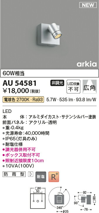 AU54581エクステリア LEDスポットライト arkia耐塩仕様 白熱球60W相当広角タイプ 非調光 電球色コイズミ照明 照明器具 屋外用 アウトドアライト