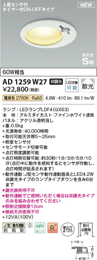 AD1259W27エクステリア LEDダウンライト ランプタイプ動作連動 埋込穴φ125 ベースタイプ 散光人感センサー付 タイマー付ON-OFFタイプ高気密SB形 白熱球60W相当 非調光 電球色コイズミ照明 照明器具
