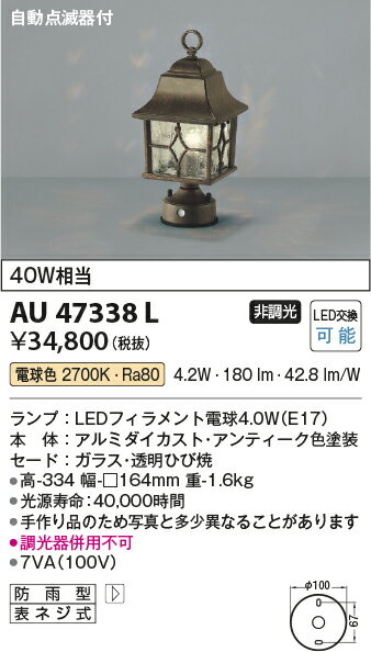AU47338Lエクステリア LED門柱灯自動点滅器付 非調光 電球色 白熱球40W相当コイズミ照明 照明器具 屋外用 アウトドアライト