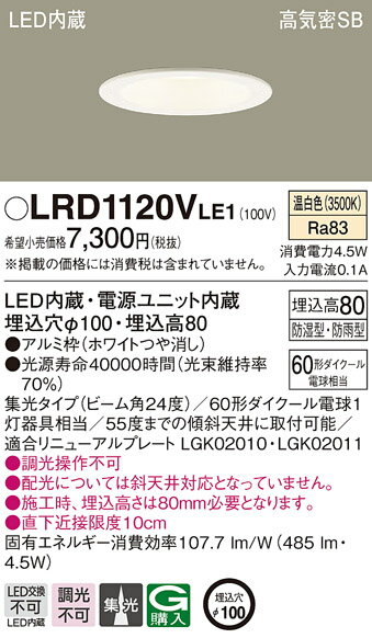 LRD1120VLE1エクステリア 軒下用LED一体型ダウンライト 高気密SB形 埋込穴φ100温白色 調光不可集光タイプ 浅型8H 防湿型 防雨型 110Vダイクール電球60形1灯器具相当Panasonic 照明器具 屋外用 天井照明 玄関・勝手口などに