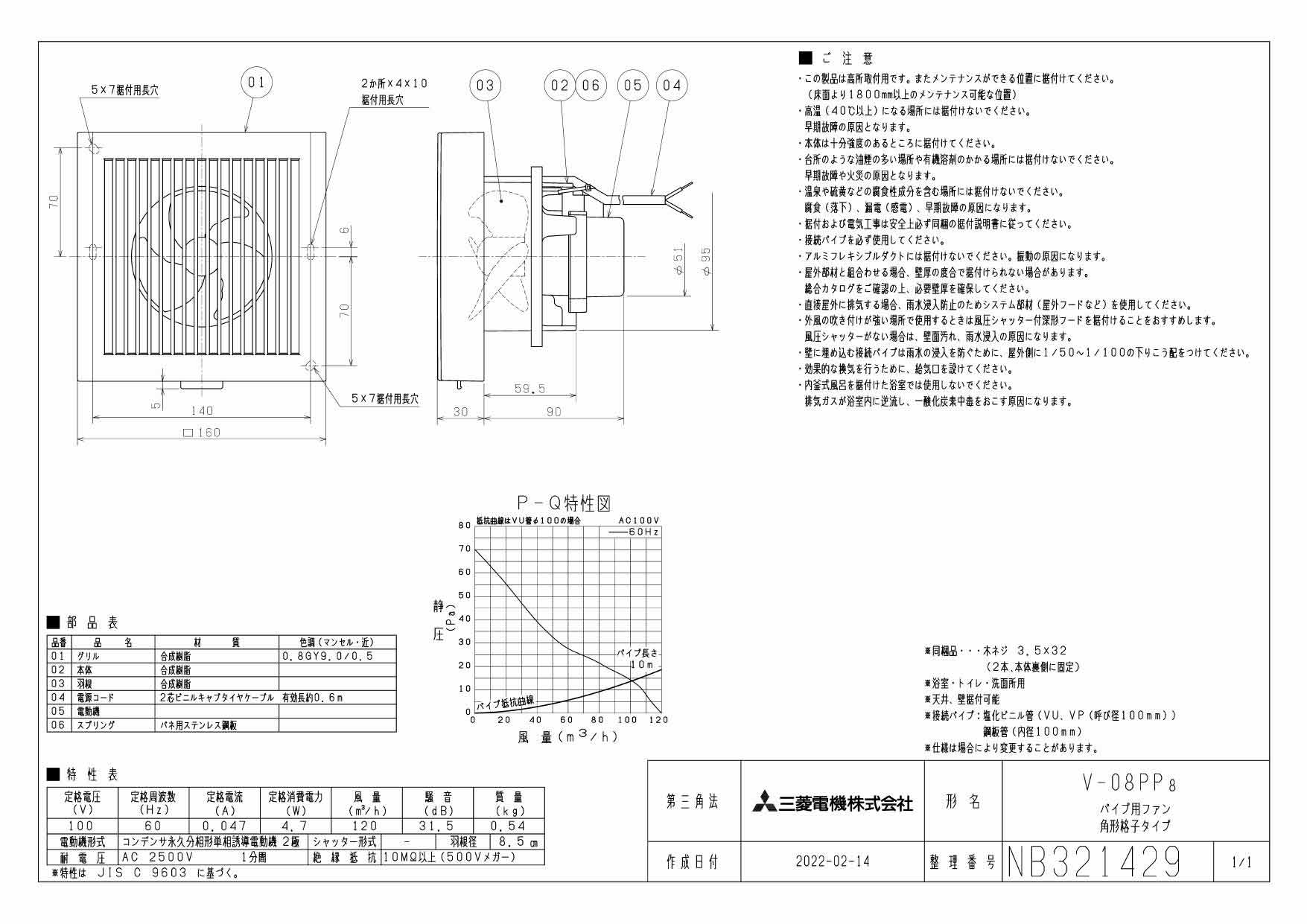 ★V-08PP8【当店おすすめ!お買得品 即日発送できます】 三菱電機 パイプ用ファン浴室・トイレ・洗面所用角形格子グリル 大風量タイプ 電源コード直付け