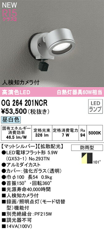 OG264201NCRエクステリア LED人検知カメラ付スポットライト GX53 白熱灯器具60W相当R15高演色 クラス2 101°拡散配光 昼白色オーデリック 照明器具 アウトドアライト 屋外用