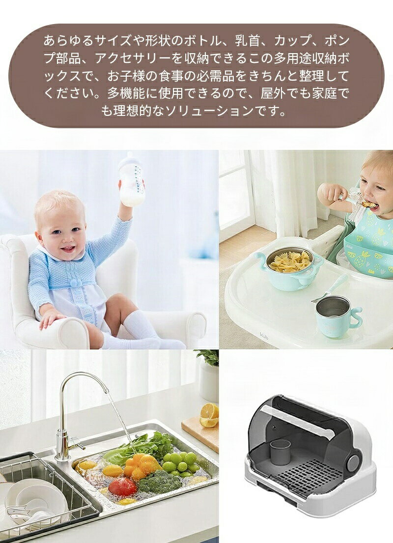 幅広い用途: あらゆるサイズや形状のボトル、乳首、カップ、ポンプ部品、アクセサリーを収納できるこの多用途収納ボックスで、お子様の食事の必需品をきちんと整理してください。多機能に使用できるので、屋外でも家庭でも理想的なソリューションです。 幅広い用途: 頑丈なPP素材で作られたこのコンパクトなドリンクウェア水切りラックは、耐久性が高く、長持ちするように作られています。幼児の哺乳瓶を整理するための長期的なソリューションとして理想的です。さらに、それは実用的です、r 幅広い用途: あらゆるサイズと形状のボトル、乳首、カップ、ポンプ部品、アクセサリーを保持するこのベビー給餌器具乾燥機で、お子様の授乳の必需品を整理整頓してください。多機能に使用できるので、屋外でも家庭でも理想的なソリューションです。 強化された保管保護: 保護カバーと優れた密閉性を備えたこのカップニップル乾燥スタンドは、ボトルを清潔で衛生的に保ち、ほこりや破片から保護します。 幅広い用途: あらゆるサイズや形状のボトル、乳首、カップ、ポンプ部品、アクセサリーを収納できるこの折りたたみ式ベビードリンクウェアラックで、お子様の食事の必需品を整理整頓してください。多機能に使用できるので、屋外でも家庭でも理想的なソリューションです。