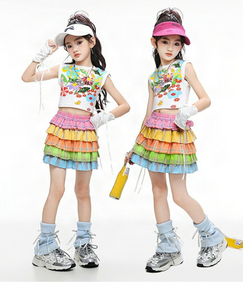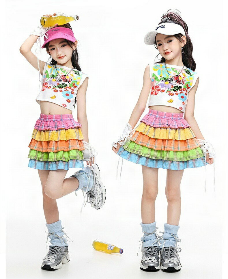 花柄 へそ出しシャツ カラフルな虹 マルチカラー スカート キッズ ダンス衣装 ヒップホップ セットアップ HIPHOP 子供服 女の子 チアガール トップス おしゃれ かっこいい 派手 個性 k-pop jazz ステージ衣装 幼稚園 発表会 応援団 演出服 練習着 文化祭 110-180cm