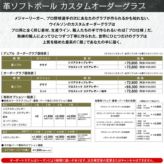※シミュレーションサイトのエラーにより、シミュレーションした内容と出力されるPDFの内容が異なる場合があります。PDFの内容を必ずご確認いただき、シミュレーション内容と異なる場合は、内容を修正後に当ショップに送信してください。お送りいただくPDFの内容が優先されますので、あらかじめご了承ください。 ★グラブ型付けをご希望の場合、オーダーグラブとグラブ型付けを一緒のカートに入れてご注文ください。 ★注文内容に不備や確認事項がある場合、当ショップより確認のお電話をいたしますので、日中に連絡の取れる電話番号を必ずご記入ください。注文内容の確認にお時間がかかる場合、オーダー商品の手配・納期に遅延が生じる可能性があります。 ★この商品はシミュレーション完了後に表示される金額から10%OFFさせていただきます。 ★注文確定後に当ショップよりメールをお送りいたしますので、そちらに返信する形でシミュレーション時に保存したPDFをお送りください。楽天市場からの自動配信メールに返信いただいても当ショップでは確認できませんのでご注意ください。 この商品ページは「革ソフトボール用オーダーグラブ・ミット ウイルソンスタッフ・カスタムオーダーグラブ」です。 ●シミュレーション内容が本商品と異なる場合、お送りいただいたPDFの内容を優先いたします。 ●シミュレーションサイトで選択できる範囲のみ対応可能となります。 ●メーカー都合により、シミュレーションサイトは予告なく変更・終了する場合があります。 ●備考欄へ要望をご記入いただいても対応できない場合がありますので、シミュレーション前に一度ご連絡ください。 【価格について】 ●商品ページの表示価格はオプションなどを含まない最低価格となります。 ●ご注文確定後にオーダー内容にあわせて価格を修正いたします。 ●シミュレーション結果と販売価格の差額分(追加料金)は「ラッピング(包装紙)」の項目で加算させていただきます。楽天市場のシステム上、項目名を変更することができませんので、あらかじめご了承ください。 【納期について】 ●通常納期はメーカー手配後から「60〜90営業日(土・日・祝日を除く)」の予定です。 ●メーカーの生産状況や注文時期により、納期目安より大幅に遅れる場合があります。 【注意事項】 ●ご注文確定後のお客様都合によるキャンセル・返品・交換はお受けできません。 ●ご注文内容に不備がある場合、キャンセルや発送延期となる可能性があります。 ●代金引換・後払い決済でのご注文はキャンセルさせていただきます。 ●商品発送前であっても、他の商品の追加はお受けできません。 ●他の商品と一緒にご注文されますと、受注生産品の納期に合わせての同梱発送となります。同時注文した他の商品のみを先に発送することはできません。 メーカー希望小売価格はメーカーカタログに基づいて掲載しています