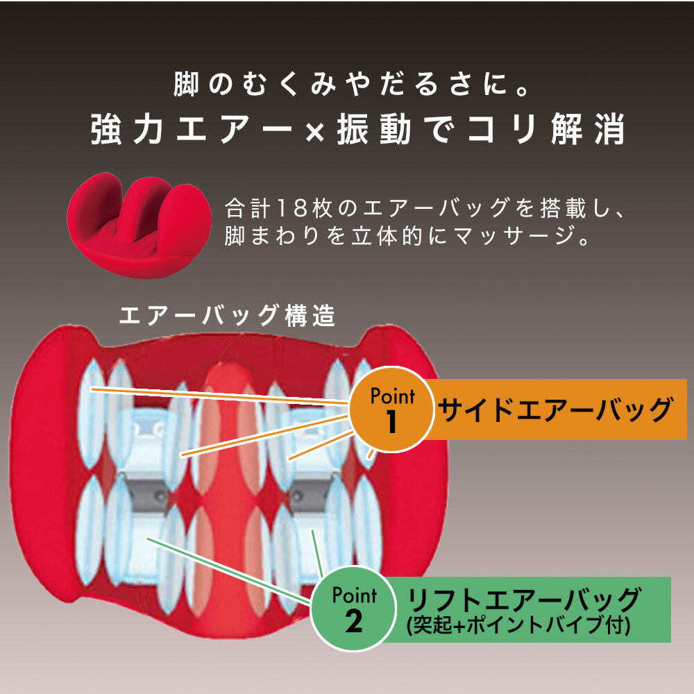 エイミー エアリーフット AiMY Airly Foot 身体の動きに合わせてフィット。お気に入りの場所でいつでもマッサージ 球形の底面デザインにより、身体の動きに合わせて角度が変わるので、床はもちろん、椅子やソファーの上など、お気に入りの場所で心地のよいマッサージが体感できます。 入れる方向を変えてフィット感UP! 「ふくらはぎ」「足うら」の使用時に入れる方向を変えることで、フィット感がさらにUPします。 強力エアーが脚まわりを集中ケア 合計18枚のエアバッグを配置し、脚まわりを立体的にマッサージ。突起とポイントバイブが合体したリフトエアーバッグが底部から振動しながら押し上げ、形状の異なるサイドエアーバッグがグイグイ締め上げます。 選べる3種の自動コース(強/弱) ・自動コース:足うら(エアー+振動) ・ふくらはぎ(エアー) ・集中ケア(エアー+振動) スペック ■商品名・型番 エアリーフット・AIM-007 ■カラー レッド(RE)・ダークブラウン(DB) ■医療機器認証番号 226AGBZX00059000 ■使用電源 AC100V 50/60Hz ■消費電力 35W ■ACアダプター定格 入力:AC100 50/60Hz 0.5A 出力:DC12V 2.0A ■ACアダプターコード長さ (約)1.75m ■外形寸法 (約)幅45×奥行き36×高さ31.5cm ■質量(ACアダプター除く) (約)4.0kg ■材質 本 体:スチールパイプ・ウレタンフォーム 張り地:ポリエステル100% ■JANコード(RE)4580161453472・(DB)4580161453489 ■原産国 中国 ご利用シーン お祝い事・お返し 誕生日祝い 入学祝い 卒業祝い お礼 成人祝い 内定祝い 就職祝い お祝い返し 出産内祝い 出産祝い 結婚内祝い 結婚祝い 結婚式 引き出物 栄転祝い 昇進祝い 転勤 還暦祝い 謝礼 御礼 初節句祝い 退職祝い 移転祝い 退院祝い ギフト 誕生日 記念日 クリスマス バレンタインデー ホワイトデー お土産 ご来場プレゼント 来客 表彰 プチギフト プレゼント 挨拶まわり 贈答品 おもたせ 菓子折り 記念品 お取り寄せ 定年退職 開店祝い お見舞い ご挨拶 引っ越しの挨拶 大切な人へ 友達 お母さん お父さん お姉ちゃん お兄ちゃん 妹 弟 彼女 彼氏 おばあちゃん おじいちゃん 奥さん 旦那さん 先輩 後輩 上司 先生 同僚 部下 取引先 お客様 いとこ はとこ 高校生 大学生 社会人 季節柄 1月 お年賀 正月 成人の日2月 節分 バレンタインデー 旧正月3月 ひな祭り ホワイトデー 春分の日 卒業 卒園 お花見 春休み4月 イースター 入学 入園 就職 入社 新生活 新年度 春の行楽5月 ゴールデンウィーク こどもの日 母の日6月 父の日7月 七夕 お中元 暑中見舞い8月 夏休み 残暑見舞い お盆 帰省9月 敬老の日 シルバーウィーク10月 孫の日 運動会 学園祭 ブライダル ハロウィン11月 七五三 勤労感謝の日12月 お歳暮 クリスマス 大晦日 冬休み 寒中見舞い 【キーワード】 フットマッサージ機 フットケア 足マッサージャー 足裏マッサージ機 足裏ローラー ふくらはぎマッサージ ふくらはぎマッサージャー エアーマッサージャー 電動マッサージ機 足むくみ解消 足疲れケア リラックス家電 マッサージ器 足 マッサージ機 フット マッサージ機 足裏 マッサージ器 ふくらはぎ マッサージ器 エアー 脚マッサージ機 フットリフレ リフレクソロジー ヒーター付きマッサージ機 温熱マッサージ機 オフィス癒しグッズ 在宅ワーク 疲れ 敬老の日 プレゼント 父の日 ギフト 健康 母の日 家電 ギフト 誕生日プレゼント 健康グッズ 実用的ギフト 高齢者 健康家電 マッサージ器 コンパクト 静音マッサージ機 自宅マッサージ