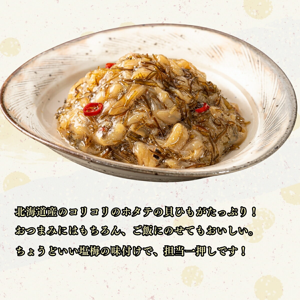 保存方法到着後は必ず冷凍庫で保管してください。解凍後はお早めにお召し上がりください。原材料ホタテヒモ(北海道)、醤油、還元水飴、昆布、砂糖、ホタテエキス、発酵調味料、するめ、醸造酢、昆布エキス、魚介エキス、唐辛子、みりん/ソルビトール、調味料(アミノ酸等)、増粘剤(キサンタンガム、グァーガム)、ph調整剤、甘味料(ステビア、カンゾウ)、酒精、(一部にいか・小麦・大豆を含む。))関連商品はこちらボイルずわいがに 脚 てんこ盛3kg 10-13...特大3L(1肩300g以上) ボイルずわいがに...【業務用/産地箱】特大3Lサイズ(1肩300g...ボイルずわいがに 脚 1kg 4肩/1-2人前 ...