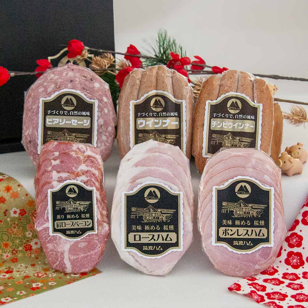加熱食肉製品(加熱後包装) 商品名 お歳暮 ギフト セット いちまつ 原材料産地 国産豚肉(茨城県産) 内容量 ロースハムスライス70g ボンレスハムスライス70g 肩ロースベーコンスライス70g ウインナー100g チンピウインナー100g ビアソーセージ50g ギフト箱 原材料名 ロースハムスライス 豚ロース肉(茨城県産)、食塩、砂糖/リン酸塩(Na、K)、調味料(アミノ酸等)、発色剤(硝酸K、亜硝酸Na) ボンレスハムスライス 豚もも肉(茨城県産)、食塩、砂糖/リン酸塩(Na、K)、調味料(アミノ酸等)、発色剤(硝酸K、亜硝酸Na) 肩ロースベーコンスライス 豚肩ロース肉(茨城県産)、食塩、砂糖/調味料(アミノ酸等)、発色剤(硝酸K、亜硝酸Na) ウインナー 豚肉(茨城県産)、豚脂肪、食塩、玉ねぎ、香辛料、砂糖、にんにく/リン酸塩(Na、K)、調味料(アミノ酸等)、発色剤(硝酸K、亜硝酸Na) チンピウインナー 豚肉(茨城県産)、豚脂肪、食塩、玉ねぎ、香辛料、七味唐辛子(ごま、のり、唐辛子、ふくれみかんの皮(みかんの皮))、砂糖、にんにく/リン酸塩(Na、K)、調味料(アミノ酸等)、発色剤(硝酸K、亜硝酸Na) ビアソーセージ 豚肉(茨城県産)、豚脂肪、食塩、香辛料、砂糖/リン酸塩(Na、K)、調味料(アミノ酸等)、発色剤(硝酸K、亜硝酸Na) 賞味期限 14日間(冷蔵・未開封)別途商品ラベルに記載。 保存方法 10℃以下で保存(要冷蔵) アレルギー情報 豚肉・ごま 製造者 有限会社筑波ハム茨城県つくば市学園の森3-21-1 備考 その他の商品も同梱可能ですが、その場合ギフト箱にお入りきらない場合もございます。 手作りのために各重量前後の商品がセット内で価格重量の調整してお届けいたします。 ご依頼主とお届け先が違う場合は、商品に明細等、価格のわかる物は同封いたしませんのでご安心下さい。 ギフト対応 ギフト包装 ギフト包装・お熨斗が含まれております。お熨斗へのご記名は備考欄にてご指定ください。 クリスマスギフト包装はお熨斗・名入れの対応不可となります。 クリスマス包装紙は3種類からのお届けとなります。お選びは出来ません。あらかじめご了承ください。 備考 ご注文時には、「ギフト対応について」の内容を必ずご確認ください。※ご自宅へのお届け時には発泡ギフト箱+保冷剤+手提げ袋付となります。お歳暮 ギフト セット いちまつ 茨城県名産品を詰め合わせた冬限定の贈り物。 美味しいもの好きな方へ、心を込めた冬ギフトのプレゼントはいかがでしょうか。 お肉の美味しさを存分に楽しんでいただける、筑波ハム自慢の王道の製品を詰め合わせたギフトセットです。 ロースハム、ボンレスハム、肩ロースベーコン、ソーセージなどのバランスの良いスライスパックは食べきりサイズで、使い勝手も抜群! そのまま食べれば、お肉の旨味を味わえ、軽く火を入れてお召し上がりいただくと、また違った味わいが楽しめます。 お世話になった大切なあの方へ、冬の御挨拶と共に、美味しい筑波ハムの贈り物をぜひご利用ください。 セット内容 ■ロースハムスライス【DLGコンテスト金賞受賞】 脂がのったしっとり、柔らかな食感が特徴です。さっぱりとした中にコクがある脂肪を適度に含んでいるので、旨味を強く感じることが出来ます。サラダやオードブル、サンドイッチなど、そのまま召し上がるのがオススメです。 ■ボンレスハムスライス 肉質は柔らかく、きめが細く、脂身を抑えた肉本来の美味しさをハムの中に封じ込めた逸品。あっさりとしているので、サラダやサンドイッチなどに入れてそのまま召し上がるのがオススメです。 ■肩ロースベーコンスライス 赤身の中にとろける脂身とコクのある味わいが柔らかな肉に凝縮されています。適度に脂身があり、旨味、こく、風味がよいので、オードブルやサラダにお使いいただくと、見た目も華やかでおもてなしにピッタリです。お酒にも合う味わいです。 ■ウインナー【DLGコンテスト銀賞受賞】 「パリッ」とした歯ごたえとともに、あふれだすジューシーなおいしさをお楽しみいただけます。そのままでもお召し上がりいただけますが、焼き目がつく程度に軽く炙ったり、ボイルしたりすれば更に美味しい! ■チンピウインナー 筑波山に伝わる福来(ふくれ)みかんの香りが爽やかな七味唐辛子入りの和テイストが新鮮な商品です。爽やかな福来みかんの香りとピリッとした後味でさっぱりと、お酒のおつまみにもよく合います。 ■ビアソーセージ ノンスモークで、ビールによく合うをコンセプトに作り上げられております。スモークの薫りがない、豚肉本来の味わいをお楽しみください。サラダやサンドイッチ、ピザトーストなどにもお使いいただけます。 注意事項 ギフト商品には、ギフト箱・のしが含まれています。 クリスマスギフト包装はお熨斗・名入れの対応不可となります。 クリスマス包装紙は3種類からのお届けとなります。お選びは出来ません。あらかじめご了承ください。 この商品は冷蔵商品です。クール便(冷蔵)でお届けします。 冷凍対象品と同時にご注文の場合は、2便