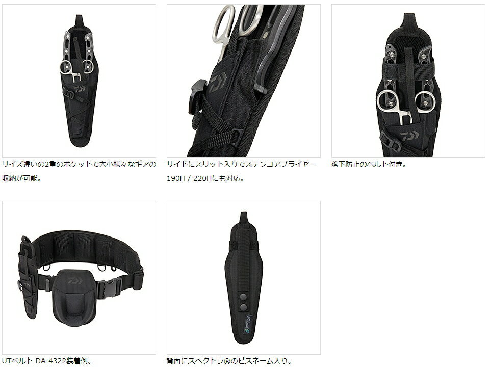 ■お買い物の前にご確認ください ⇒ 在庫表示/配送/送料等のご説明この商品の他のタイプを見る 商品情報 ダイワ DAIWA グローブライド UTマルチプライヤーケース DA-4522 / 収納 ケース UTベルト DA-4322やデイジーチェーンなど、あらゆる場所に取り付けてカスタマイズ! フィッシュグリップやハサミ類も収納可能なプライヤーケース。 1.DAIWA UTベルト DA-4322(50mm幅まで)に装着可能。 2.サイズ違いの2重のポケットで大小様々なギアの収納が可能。 3.耐久性のあるスペクトラ(R)ファブリックスを使用。 4.サイドにスリット入りで、ステンコアプライヤー 190H / 220Hにも対応。 ■発売年:2022年