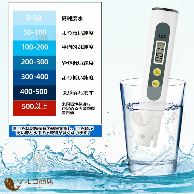 ・TDS測定器です。水中の不純物の値を測定できます。 ・TDSは溶解性固体の総量で、TDSの値が高いほど水に含まれる不純物が多いことを表します。 ・電池入りですぐに使用可能です。 商品詳細 測定範囲:0-9990ppm 誤差:正負2%-3% 分解率:1ppm 電圧:3V サイズ:25x14x134mm 重さ:40g 利用方法 1.蓋を開きます。 2.ON/OFFのボタンを押し、起動します。 3.測定する水にペンを入れ、軽く振ります。数値が安定してから【HOLD】を押し、数値をロックします。 4.本体を水から取り出し、ディスプレイに表示された数値を確認します。 「幅広い用途」TDS計は日常生活における水の安全性を検査できるだけでなく、他にも多くの用途に使用できます。 実験室、工業、汚水処理、科学研究、製薬、電気めっき液、水産養殖、飲料水、酵素、井戸水、海水、ボイラー水、金魚鉢水、プール水、写真洗浄液、インク、食品加工、イオン化水、家庭水質検査、化学品、人体尿など。 魚などの水生生物や水草の育成においても非常に有効です。 水質測定器 TDS水質測定器 水質テスター TDS測定器 水質検査 試験 メーターデジタルテスター 自動校正 水質検査キット水質測定器 水質テスター TDS測定器 水質検査 試験メーターデジタルテスター 自動校正 水質検査キット 防災用水質検査キット 災害時水質モニタリング 南海トラフ対策水質調査器 緊急時水質チェック 非常用水質分析ツール 地震後水質調査 避難所水質管理 防災備蓄水質確認 井戸水・地下水検査 簡易水質分析 当店では、人気の商品をお買い得価格でご提供中です。新作や話題の商品、ベストセラーも続々登場しています。数量限定や期間限定のアイテムは、早い者勝ちの先着順で販売中。また、クーポンやポイント還元など、今だけのお得なセールも実施しています。最新モデルや限定カラーも見逃せません! 初回限定やお試し商品もご用意しており、ギフト対応も可能です。会員様限定の特別特典や驚きの低価格商品も多数取り揃えています。在庫限りの商品はお早めにお求めください。もちろん、完全保証・返品可能で安心してお買い物いただけます。 ほとんどの商品が即日発送となっております。また緊急入荷のアイテム、業界最安値の商品もございますので、タイムセールやお買い物マラソンの際にはぜひチェックしてください。リピート率No.1のアイテムや、累計販売数を誇る人気商品も豊富に取り揃え、お客様の満足度No.1を目指しています。 商品について ※ご覧いただいているディスプレイ環境などにより、写真と実物の色味が若干異なる場合がございます。また、製造時期によりデザインや配色にわずかな違いが生じることがございます。 ※商品寸法は記載サイズと若干の誤差が生じる場合がございます。 ※国内外からセレクトした商品を取り扱っており、特に海外製品においては、製造過程における多少の汚れやほつれ、縫製の甘さが見られる場合がございます。予めご了承ください。 ※輸入品の場合、輸送中に箱の潰れが発生することがございます。箱を緩衝材とご理解いただける方のみご購入をお願いいたします。 プレゼント、贈り物にも大人気 春のおすすめアイテム 桜が咲く季節には、ピクニックや卒業・入学シーズンの新生活アイテムが人気です。進学や進級、新しい場所への引っ越しなど、新しいスタートをサポートする商品を取り揃えています。また、ホワイトデーや母の日には感謝の気持ちを伝えるギフトアイテムもご用意しております。 夏の楽しみ方 暑い季節にぴったりの、海やプールで活躍するアイテムから、バーベキューやキャンプなどのアウトドアグッズまで、夏のアクティビティに欠かせない商品が目白押しです。お盆の帰省や夏祭りのアイテムも充実しています。 秋のアクティビティ 紅葉が見ごろの秋は、運動会やハロウィンなどのイベントが盛りだくさん。スポーツや行楽にピッタリなアイテムや、仮装パーティーを盛り上げるハロウィンコスチュームなど、多様な商品をご提案します。寒さ対策の防寒グッズも見逃せません。 冬の贈り物とイベント クリスマスやお正月のシーズンには、ギフトや福袋などの特別なアイテムを揃えています。大切な人へのプレゼントや、おうち時間を楽しむための日用品、そしてバレンタインのギフトにもおすすめの商品をぜひチェックしてみてください。冬ならではのホリデーシーズンを彩るアイテムが盛りだくさんです。 日常にちょっとした幸せを 普段使いに便利な生活雑貨や美容アイテム、プレゼントにぴったりのギフトアイテムなど、幅広く取り揃えています。送料無料でお届けする商品も多数ございますので、ぜひこの機会にご利用ください。 生産国 China水質測定器 TDS 水質 テスター 水質検査 試験 デジタル 自動校正 水質測定器 水質検査 水質計 TDSメーター デジタル 不純物濃度計 水質管理 飲み水 水槽 川 不純物 温泉 下水 災害時 緊急時